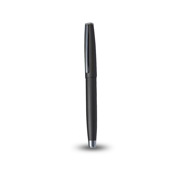 Roller matt chrome metal pen with blue ink. Product Size:13.8×1.25cm. Packaging: Polybag.