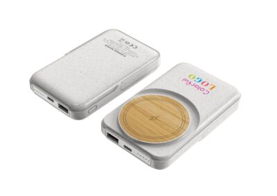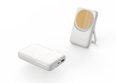 A 10000mAh magnetic powerbank with wireless charging made from wheatstraw, rubber oil & bamboo. Comes with quick charge 22.5W+ PD 20W Type-C input & output. It features a foldable aluminium stand.