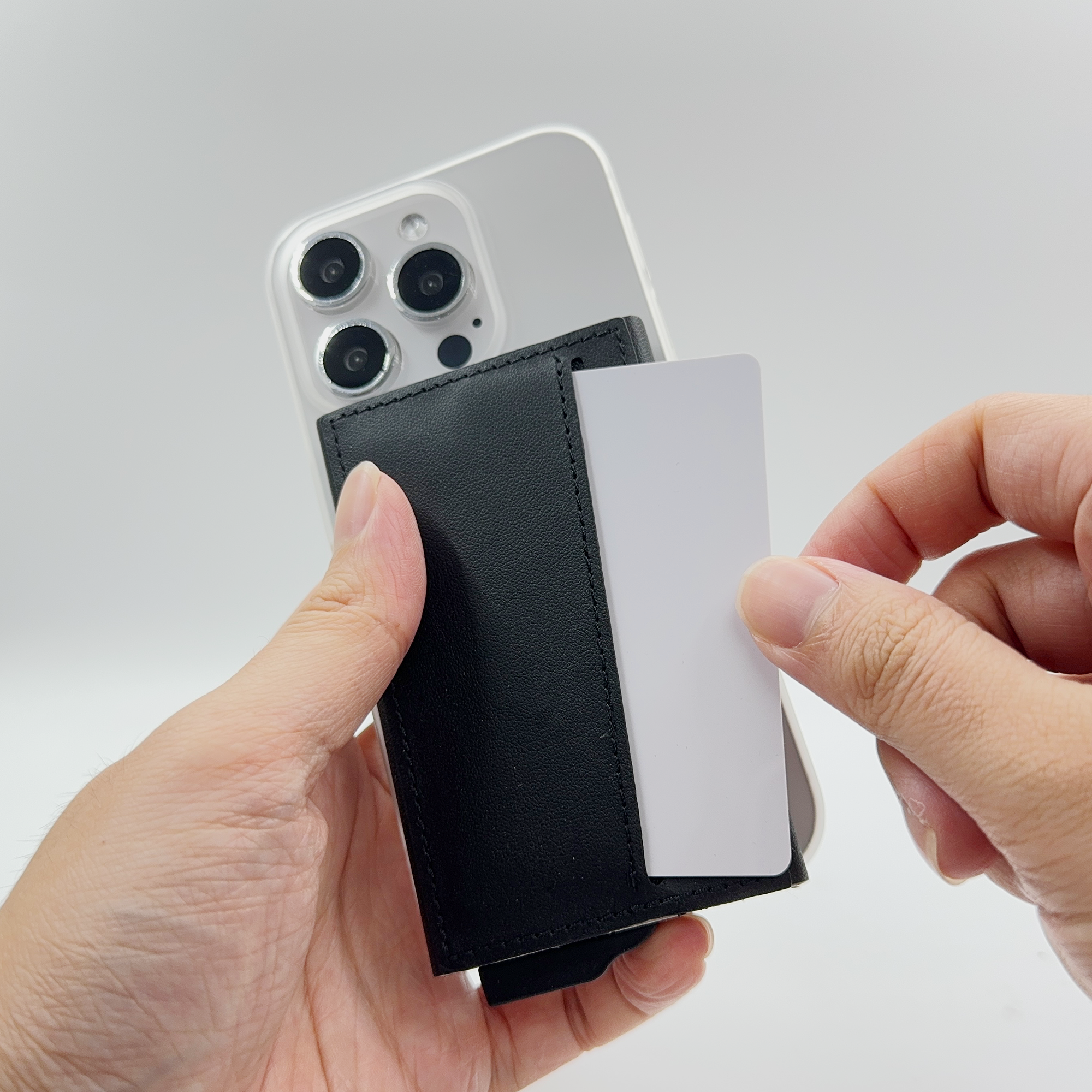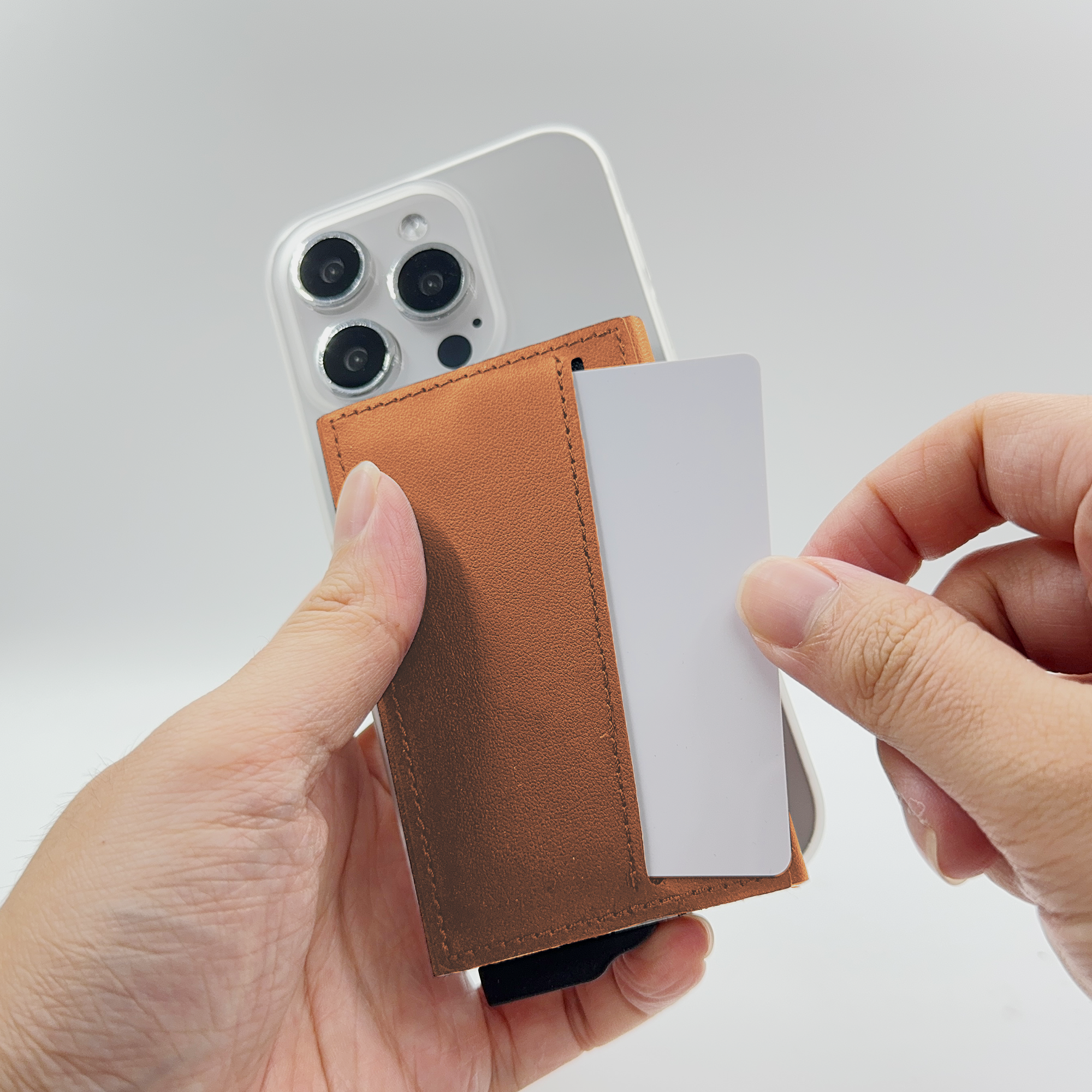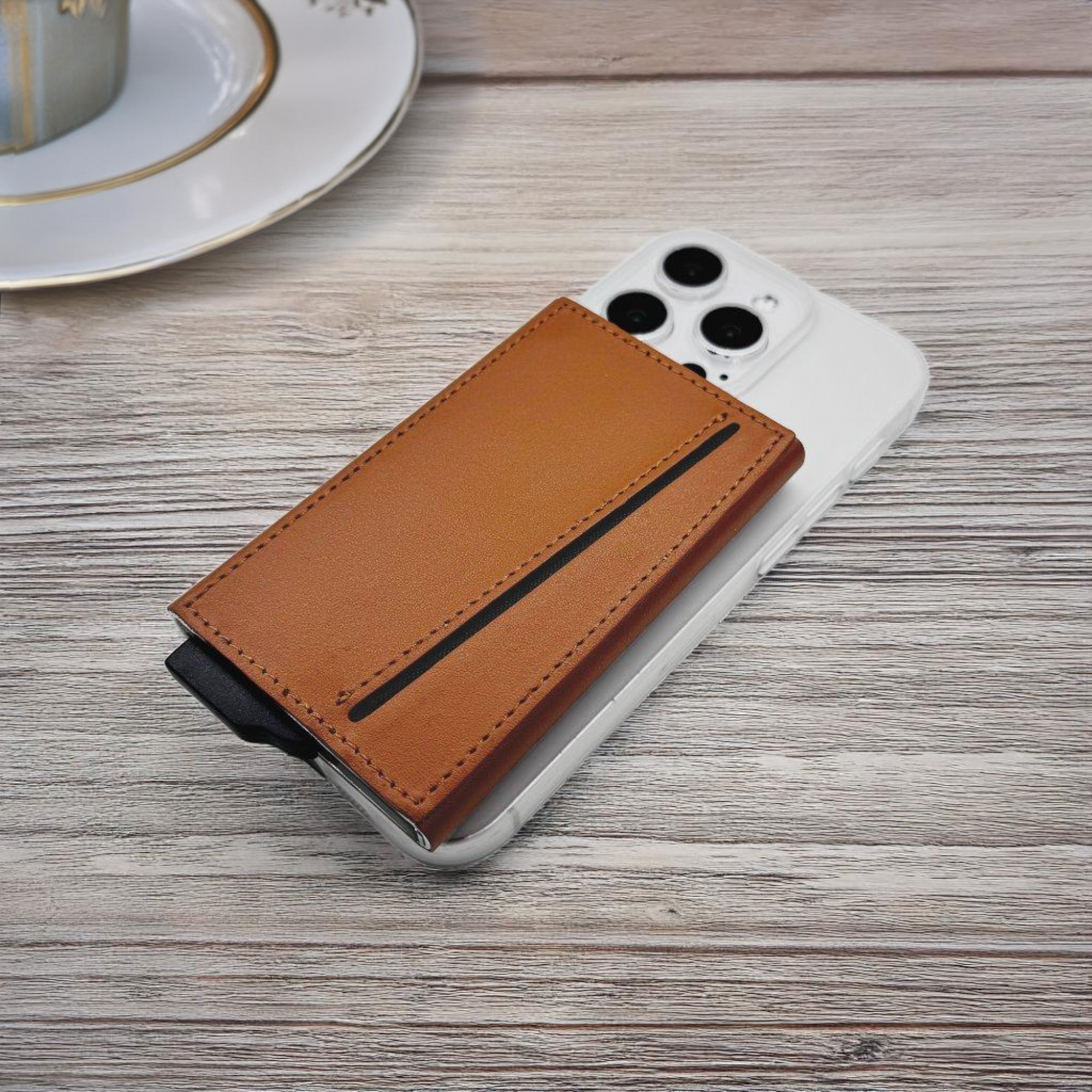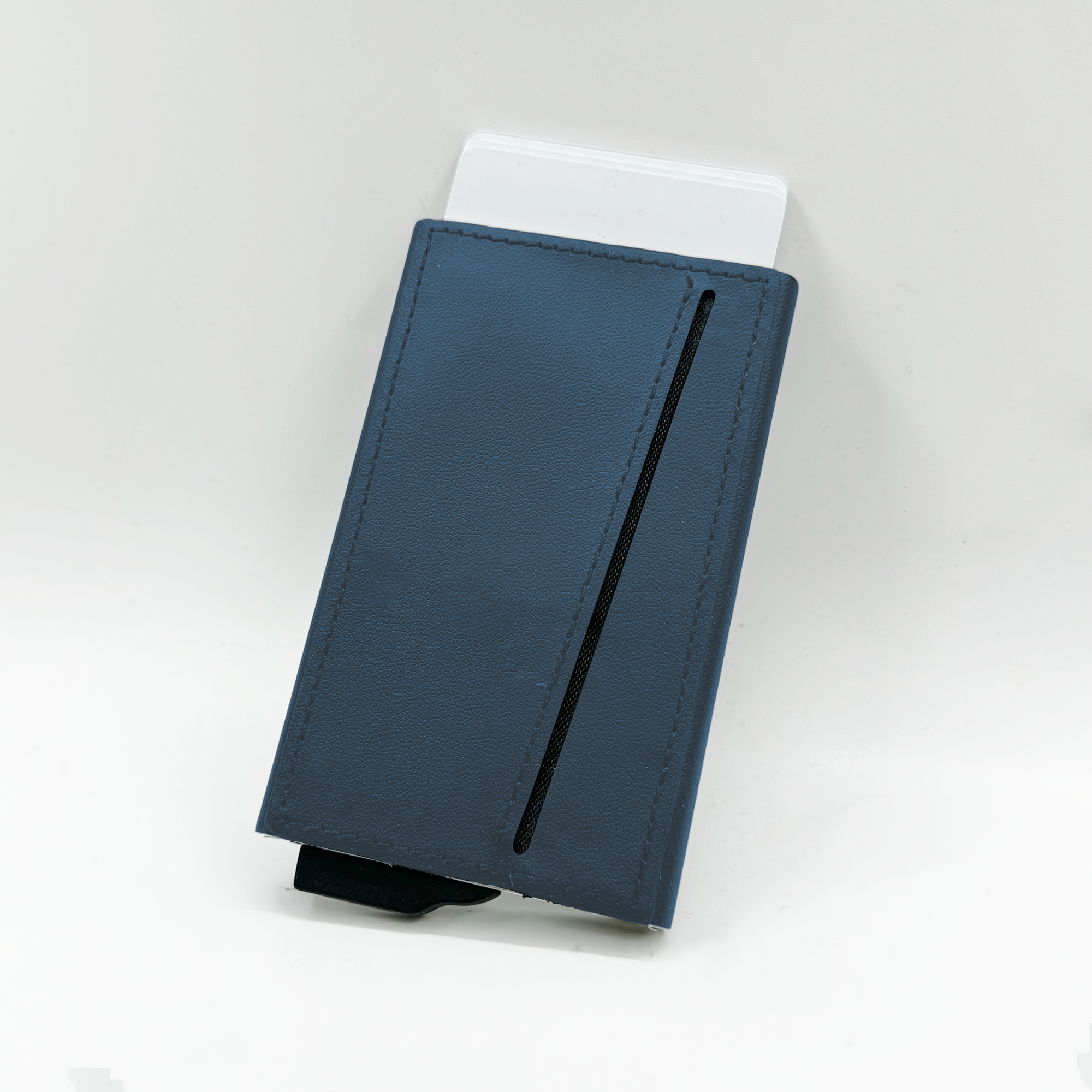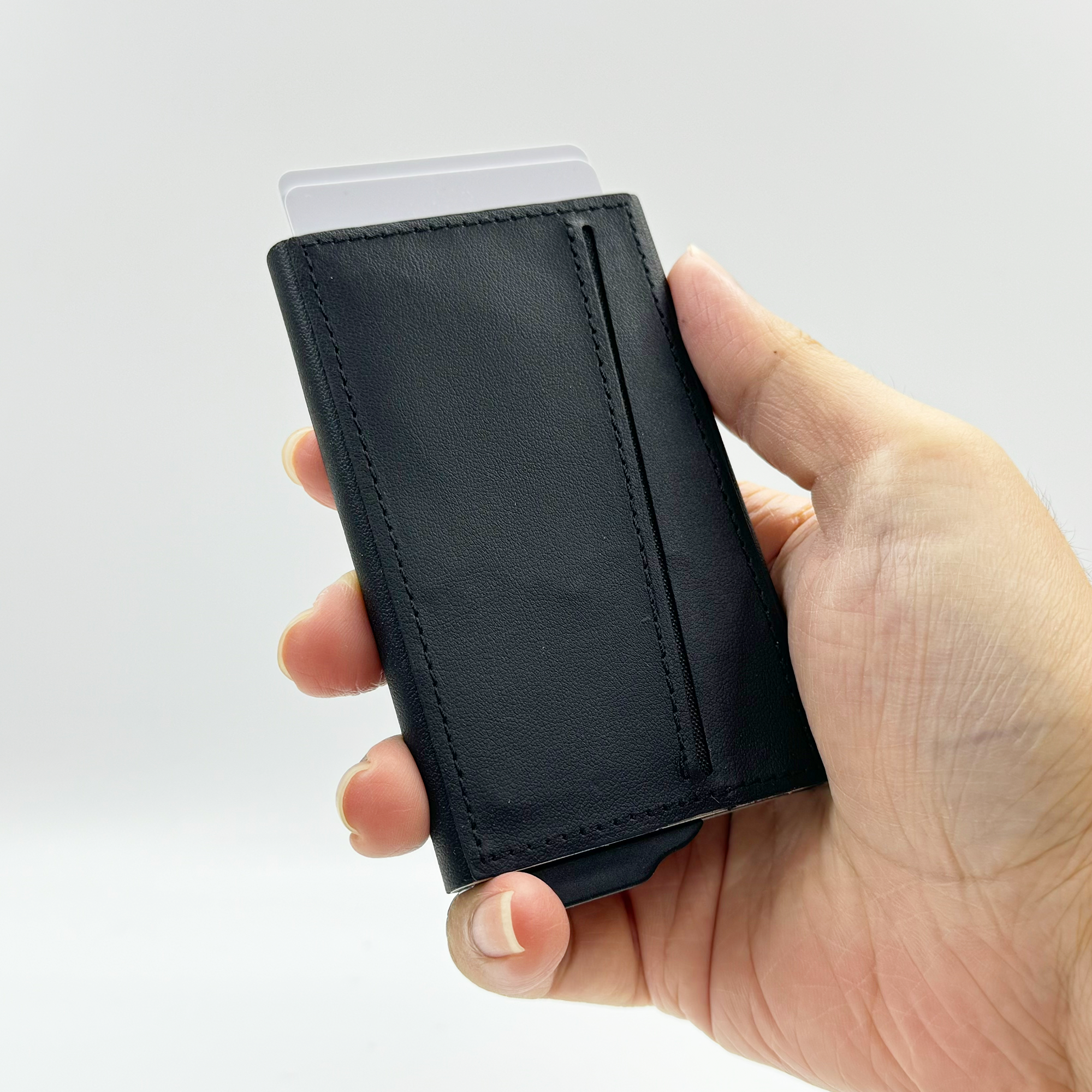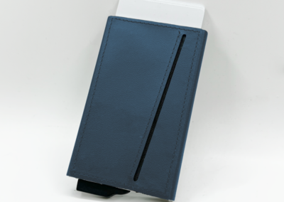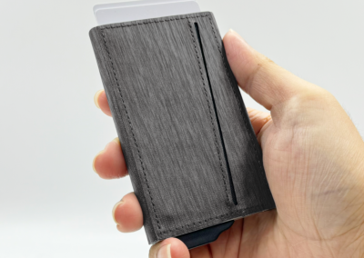 Strong magnetic recycled PU-RCS aluminium card holder that can hold up to 7 cards. Pop-up wallet with RFID and NFC blocking technology. Product Size: 10.6×6.3×1.1CM. Packaging: Kraft Paper Box