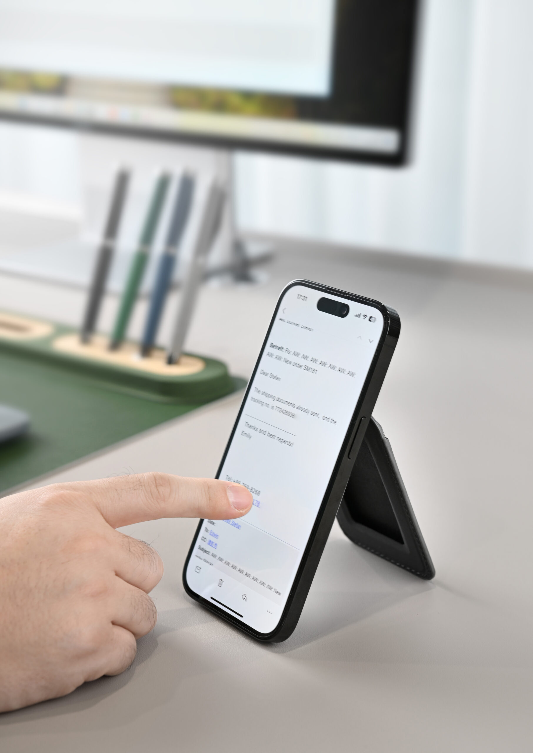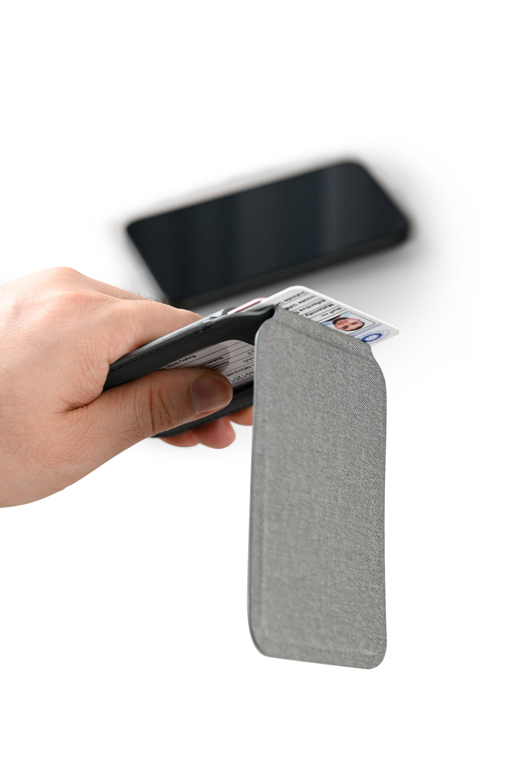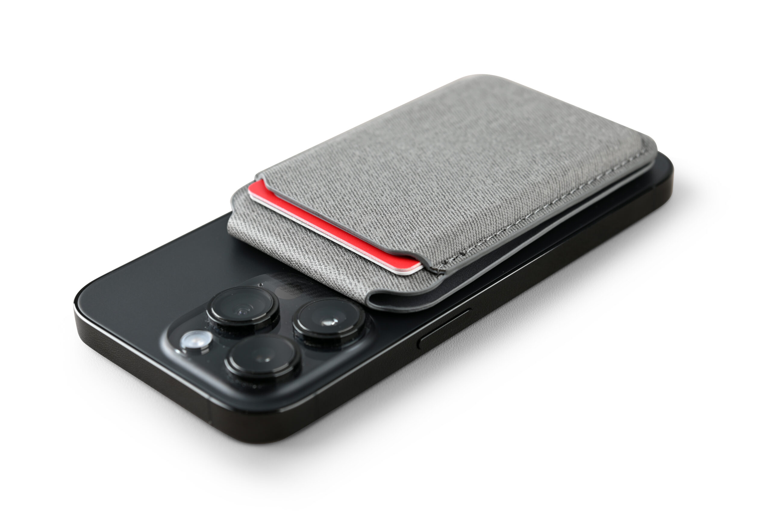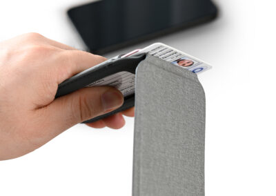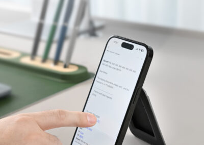 Magnetic card holder wallet that can be used as a mobile stand in recycled PU Material. Strong magnet that can stick on mobile firmly. Product Size: 9.9×6.4×0.8cm. Packaging: Kraft Paper Box