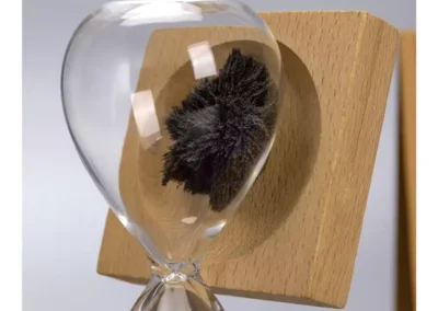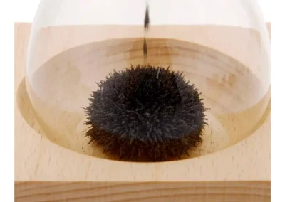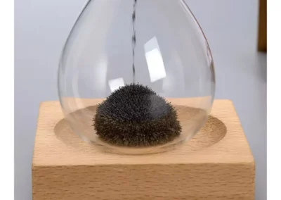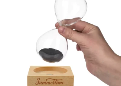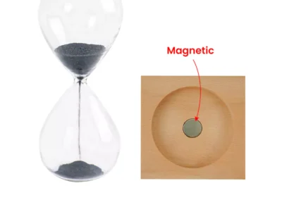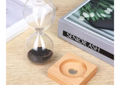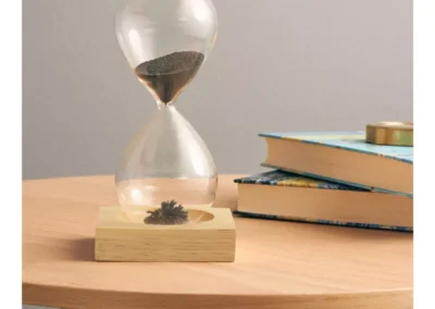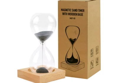 A magnetic sand timer with a wooden base is a unique and visually striking timepiece! It typically consists of a glass container filled with fine iron sand filings. As the timer runs for about 2 minutes, the iron filings are attracted to magnets placed at the base, creating beautiful patterns as they accumulate.