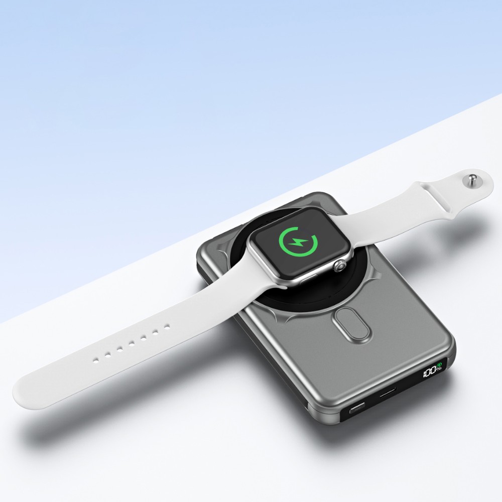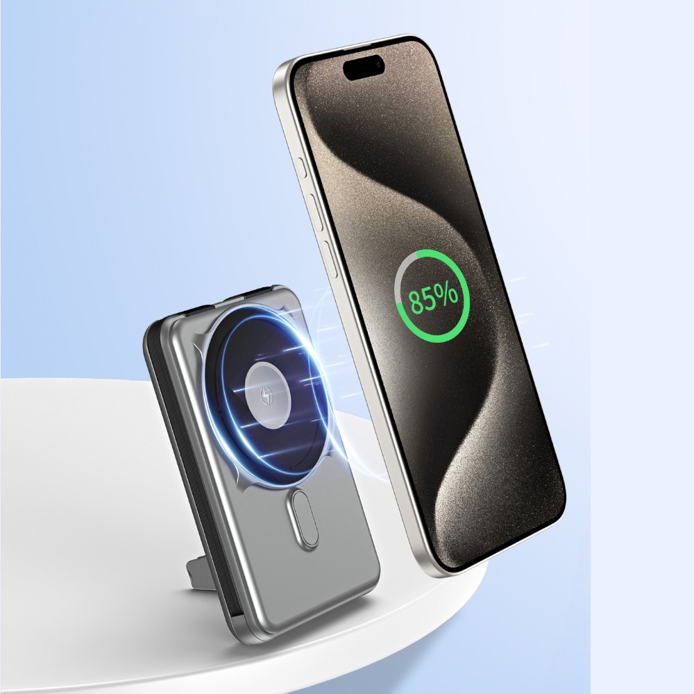 Experience the power and versatility of the Schwarzwald MagPower X, a robust 10,000mAh power bank with a sleek gunmetal finish. It features strong MagSafe and Apple Watch charging, inbuilt Type-C and Lightning cables, 20W GAN fast charging, and a convenient foldable stand. This all-in-one charger is perfect for professionals who need reliable power on the go, making it a premium corporate gift.