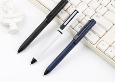 Metal Ballpoint Pen with lined barrel design. Twist action. Blue ink.