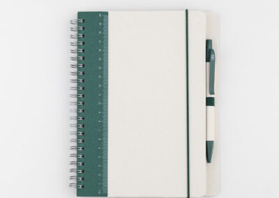 A5 size hard cover milk carton paper spiral notebook with ruler and 70 sheets – 80 gsm milk paper inner pages with lined print. Has elastic band and pen with pen holder. Product size: 20.7×16.7×1.7cm. Packaging: Kraft Paper Box