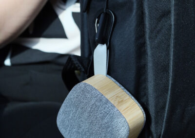 A bluetooth speaker made from a combination of ABS + Bamboo + RPET fabric with a 2-3 hours playtime & type C port.