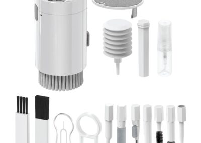 Mostar is a 20-in-1 Electronics Cleaning Set perfect for your devices and workspace. It has a screen duster, 7 brushes for extensive dust removal, keyboard key puller, refillable nozzle spray, earbuds cleaning nib, activated carbon lens cleaner, and more multi-functional cleaning instruments for your gadgets! Can clean all types of devices like keyboards, mouse, laptop and mobile phones, headphones, smart watches and wireless earbuds, especially helping you reach those difficult-to-clean spots. This is important for long term maintenance and efficiency of your devices.