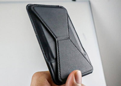 Magnetic cardholder wallet with phone stand. Slim design for easy in-and-out of pockets. Magnetically attaches to iPhone 12 / 13 / 14 / 15 series. Also comes with a magnetic ring making it compatible to other phone models, too. Phone stand allows dual vertical or horizontal orientation for perfect hands-free phone viewing.