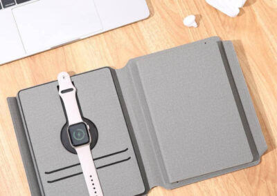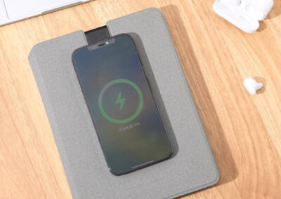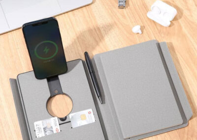 Santhome® MagSafe Smart A5 Organizer combines design elegance with latest magnetic technology. Includes a 10,000mAh powerful powerbank with a Smart 15W Mag-Wireless Charger for phone or watch, 32GB in-built USB flash drive, 64 sheet removable notebook and various card pockets, Onex is a masterpiece of sustainable and modern office technology – just snap an iPhone 12 or higher model for smart wireless charging. Onex is a CHANGE ZERO product, which means that it is developed with a net zero carbon footprint – By using RCS-certified recycled PU materials, we reduce 3% carbon emissions from material use (verified by ecoact®). Further, we offset the balance 3.87 kgCO2eq per unit by financing renewal energy projects through Climate Partner, making it a carbon-zero product. Packed in an elegant gift box.