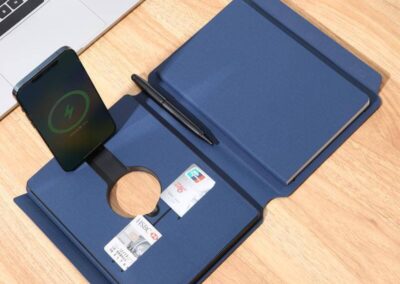 Santhome® MagSafe Smart A5 Organizer combines design elegance with latest magnetic technology. Includes a 10,000mAh powerful powerbank with a Smart 15W Mag-Wireless Charger for phone or watch, 32GB in-built USB flash drive, 64 sheet removable notebook and various card pockets, Onex is a masterpiece of sustainable and modern office technology – just snap an iPhone 12 or higher model for smart wireless charging. Onex is a CHANGE ZERO product, which means that it is developed with a net zero carbon footprint – By using RCS-certified recycled PU materials, we reduce 3% carbon emissions from material use (verified by ecoact®). Further, we offset the balance 3.87 kgCO2eq per unit by financing renewal energy projects through Climate Partner, making it a carbon-zero product. Packed in an elegant gift box.