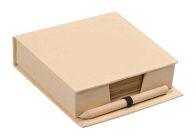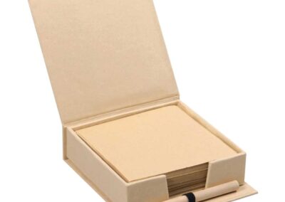 An innovative and distinctive promotional item for business promotion is a notepad with sticky notes. It was made entirely from recycled cardboard. This makes the notebook an environmentally beneficial product. The entire building has a light brown appearance. Additionally strong and resilient, this recycled paper is also long-lasting.