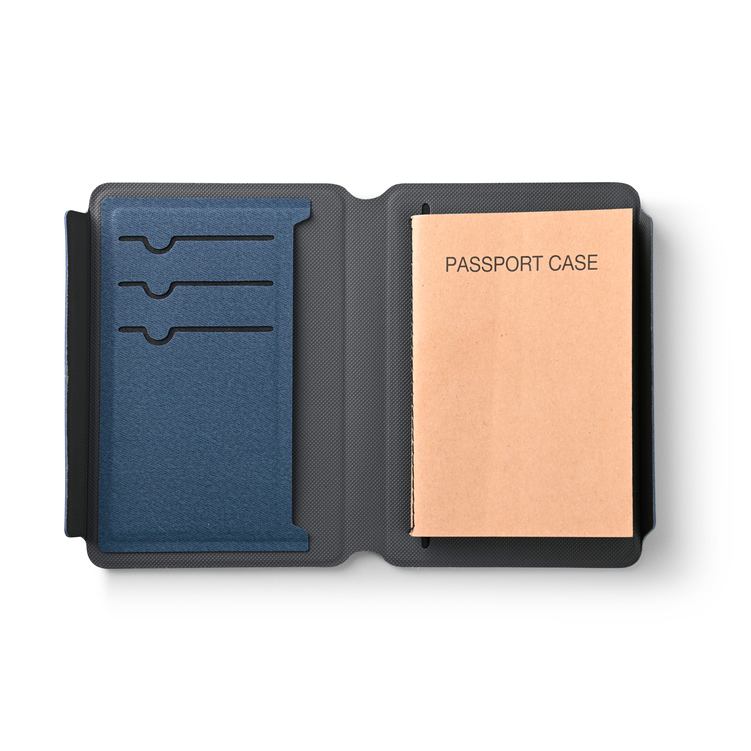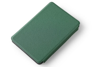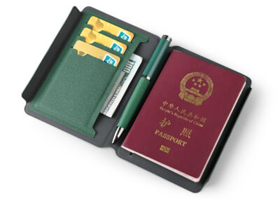 Passport Card Holder in welded recycled PU material. Simplet yet elegant design with magnetic flap closure. Product Size: 14.1×9.4×1.5cm. Packaging: Kraft Sleeve