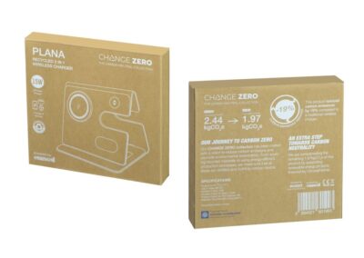 Plana is a 3-in-1 simultaneous charging station made with recycled PU and recycled ABS and featuring the latest 15W magnetic wireless charging for mobile phones, magnetic Apple Watch charger and wireless charging enabled earpods (up to 3W). All devices can simultaneously charge with a single Type C connection. Folds flat and easy to carry. Perfect gift for office and desk with a prominent branding area. Packed in a kraft gift box. This wireless charger is also a CHANGE ZERO product, which means that it is developed with a net zero carbon footprint – By using RCS-certified recycled plastic and PU, we reduce 19% carbon emissions from material use (calculated by ecoact®). Further, we offset the balance 1.97 kgCO2eq per unit by financing renewal energy projects through Climate Partner, making it a carbon-zero product.