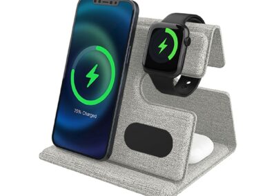 Plana is a 3-in-1 simultaneous charging station made with recycled PU and recycled ABS and featuring the latest 15W magnetic wireless charging for mobile phones, magnetic Apple Watch charger and wireless charging enabled earpods (up to 3W). All devices can simultaneously charge with a single Type C connection. Folds flat and easy to carry. Perfect gift for office and desk with a prominent branding area. Packed in a kraft gift box. This wireless charger is also a CHANGE ZERO product, which means that it is developed with a net zero carbon footprint – By using RCS-certified recycled plastic and PU, we reduce 19% carbon emissions from material use (calculated by ecoact®). Further, we offset the balance 1.97 kgCO2eq per unit by financing renewal energy projects through Climate Partner, making it a carbon-zero product.