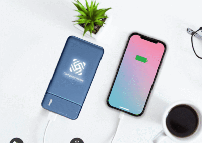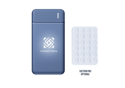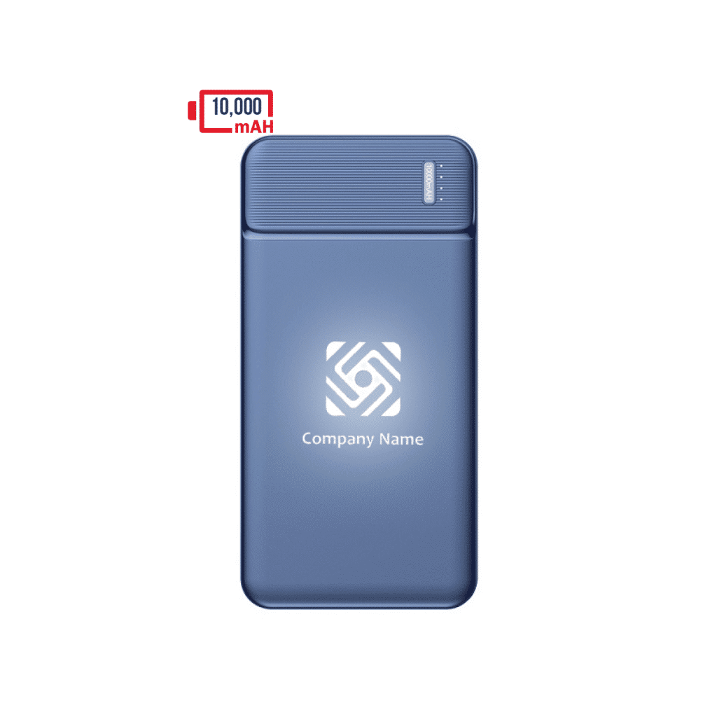 This 10,000 mAh powerbank comes in an elegant blue ABS finish with a power indicator to show you the battery level easily. It has ports for using USB output, type C input, or micro-USB input making it very versatile. Your company logo can be engraved to display it in an elegant light-up fashion which really stands out in contrast with the blue casing of the powerbank. A suction pad can be added to the box so you can stick it to your phone or any device as per your requirement.