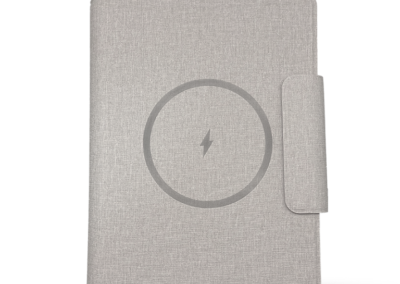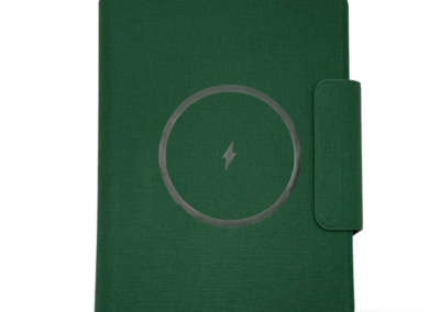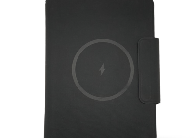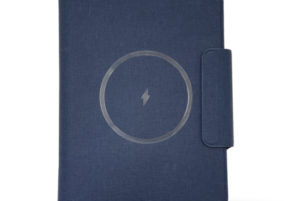 Wireless Charger Notebook with 64 sheets paper and 5000MAH Powerbank in special RCS PU material. Has lycra pockets, foldable phone stand, and pen holder.Non-stitching Welding technology. The Power system is in the spine with LED power indicator. Product Size: 23.1x17x2.5cm. Packaging: Black Paper Box