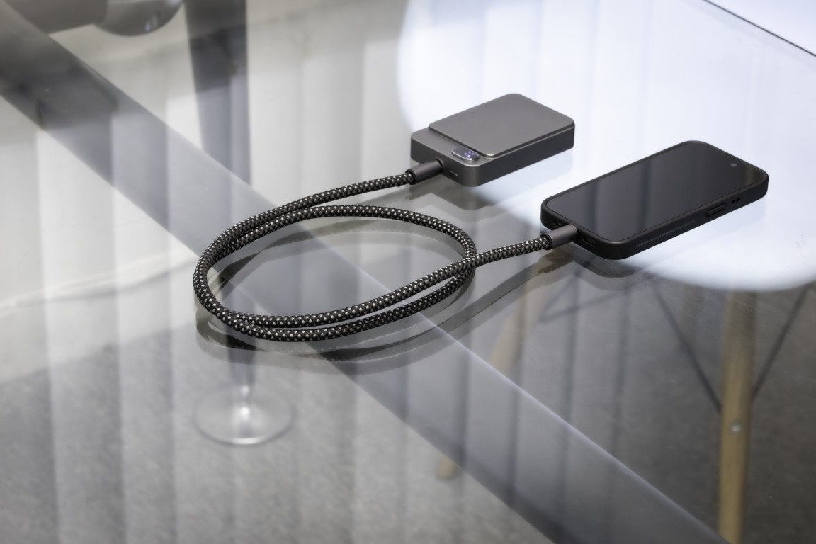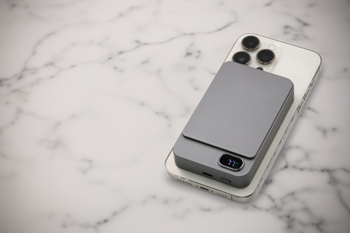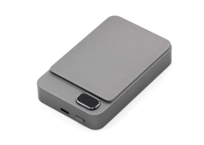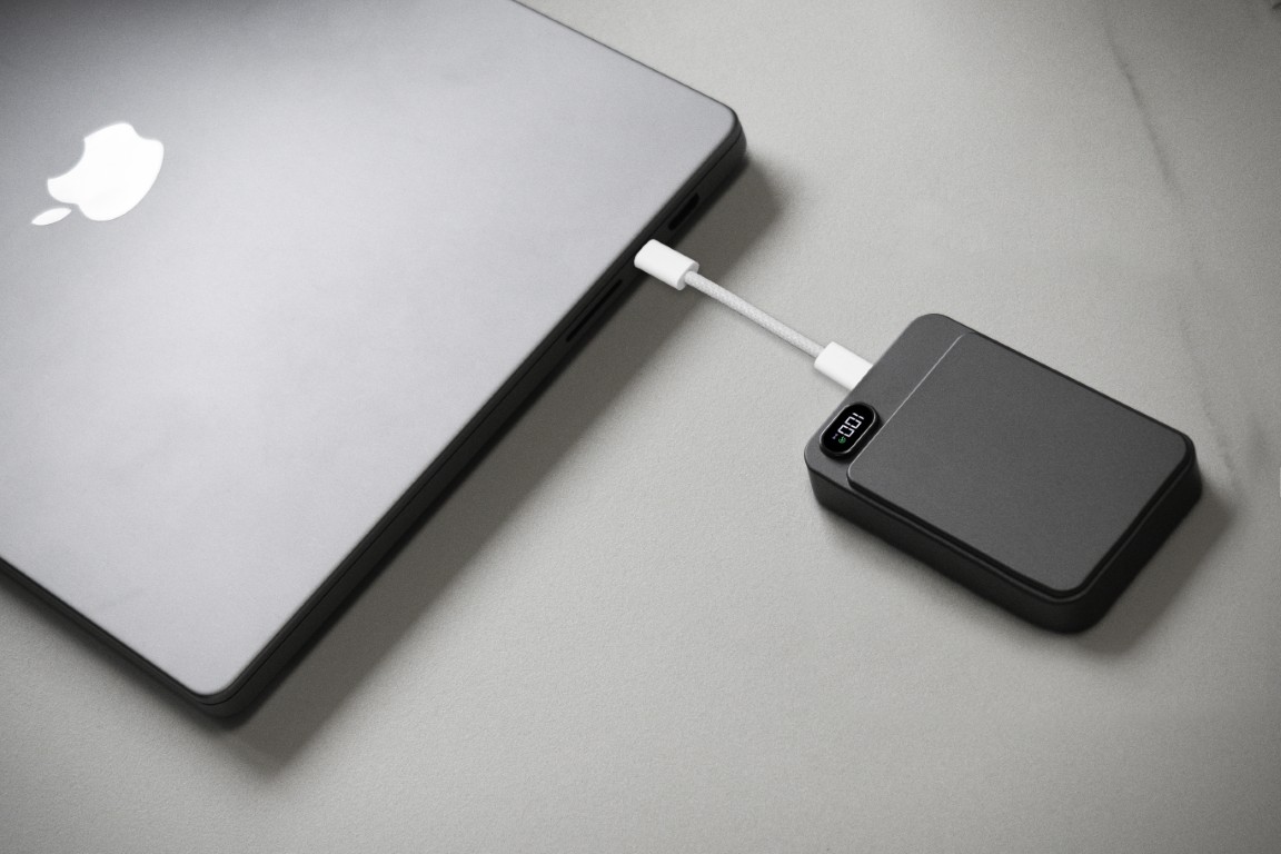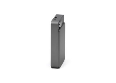 Sustainable built-in Type-C PD/Lightning Cable 10000mAh PD Power Bank Powercharge 10000 Eco: an eco-friendly, portable power bank crafted from recycled ABS. It features built-in Lightning and Type-C cables for fast charging, along with a 10,000 mAh capacity