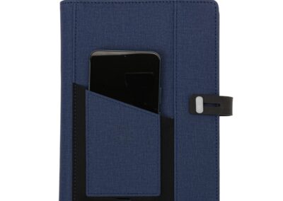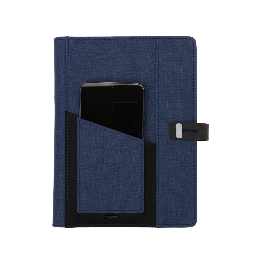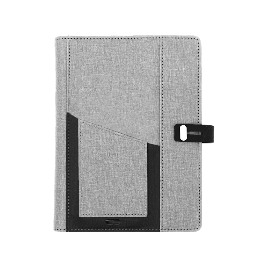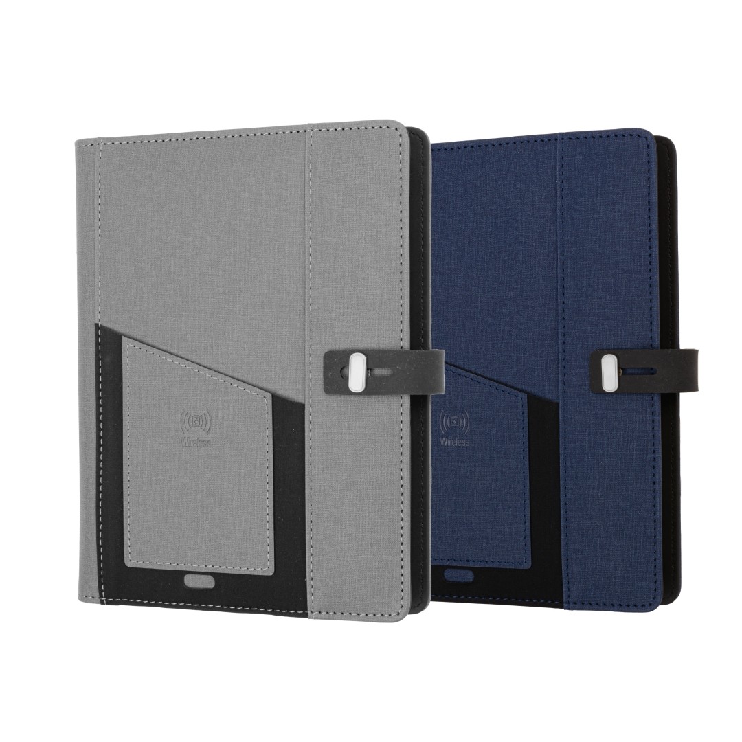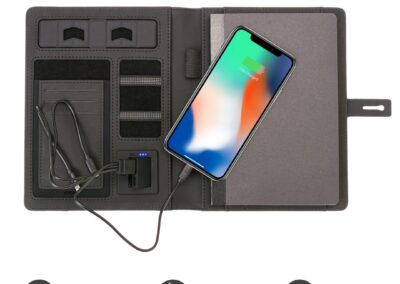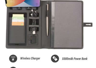 This stylish folder comes with a PU material that looks and feels excellent. There is a pocket in the front where you can simply place your phone on the go to charge wirelessly. It comes equipped with a built-in 4000mAh powerbank, A5 writing pad, and slots for mobile phones, credit cards, pens, USB cables, earphones, and other accessories. It also has a mobile/ tablet customizable stand at the top. It comes with cables supporting USB-A, USB-C, 2 IN 1 Lightning, and Micro-USB. (Pen Not Included)