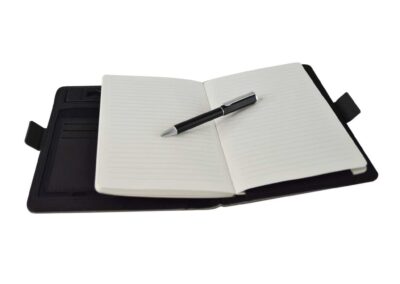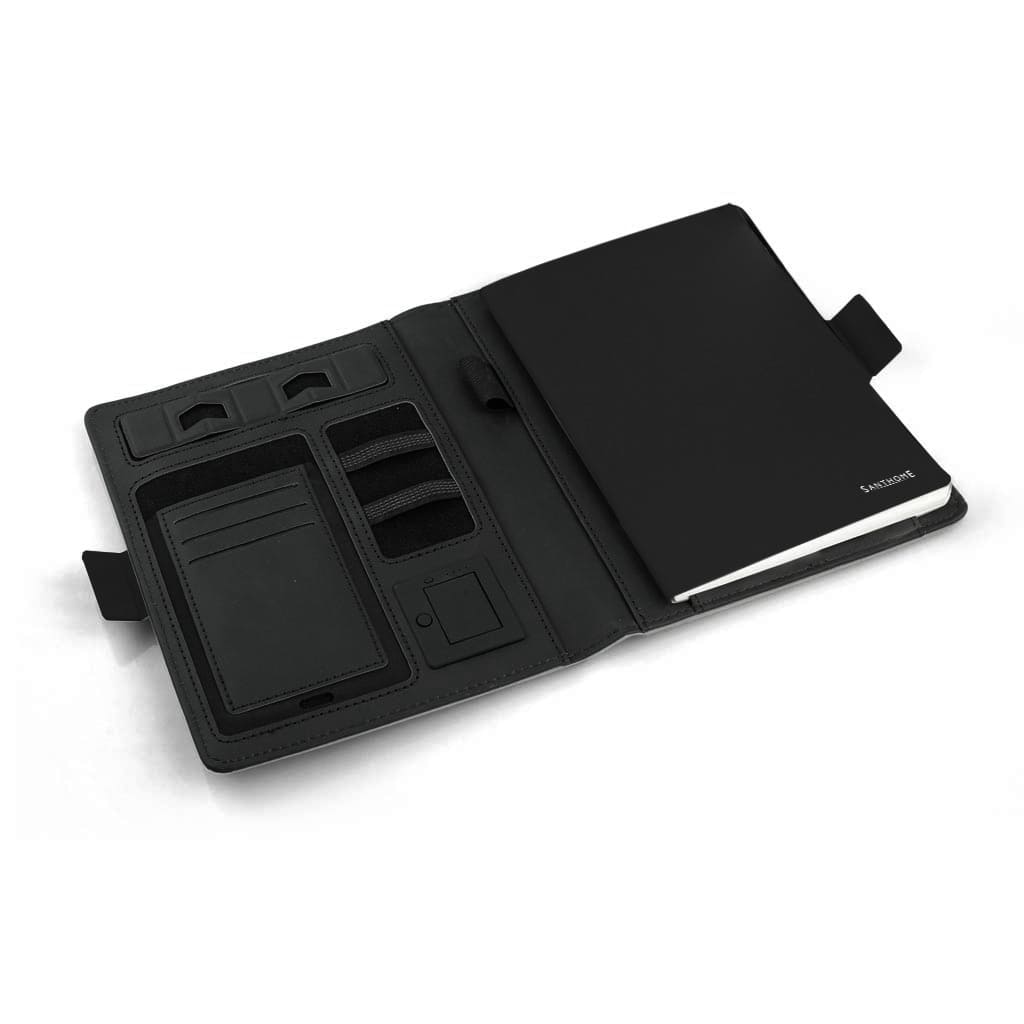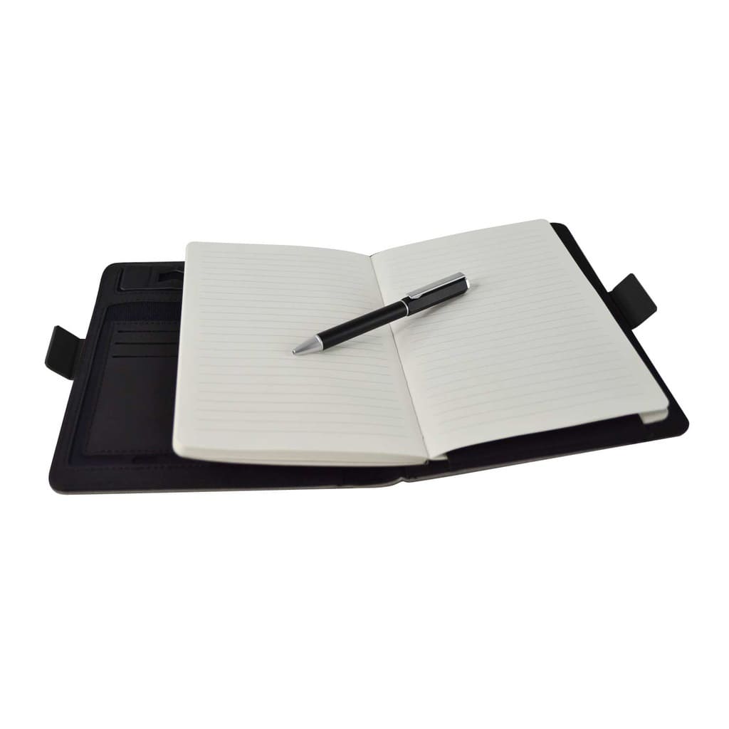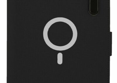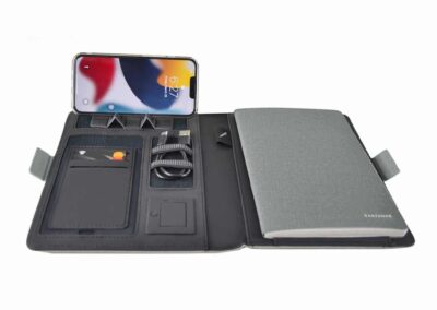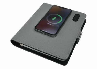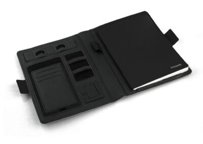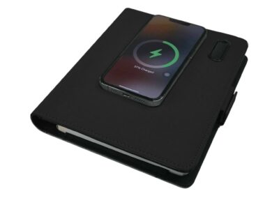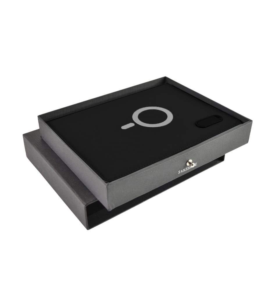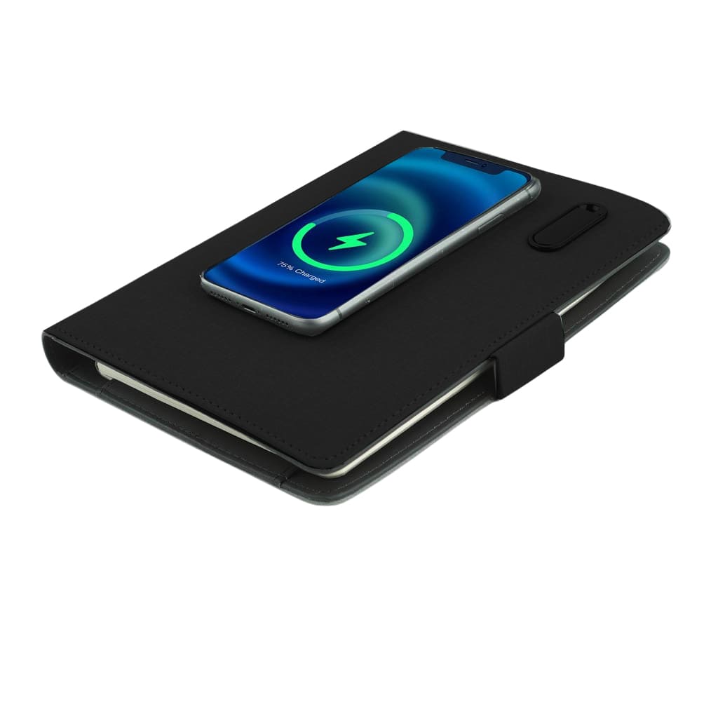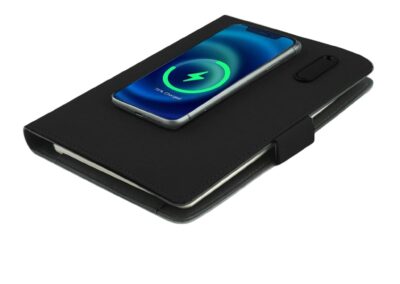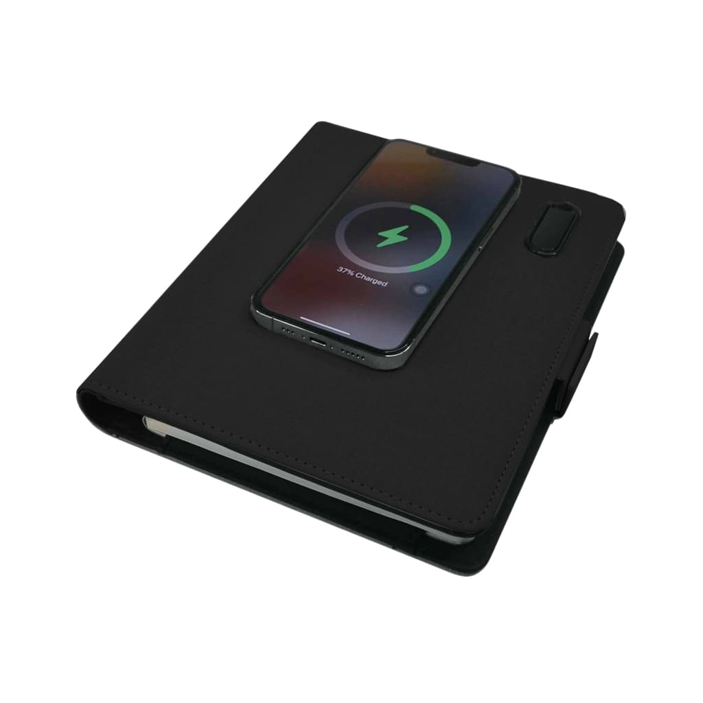 MagSafe Smart Notebook Portfolio combines design elegance and latest magnetic charging technology. With an impressive 8000 mAh powerbank, 10W MagSafe magnetic wireless charging, 32GB USB in-built flash drive, numerous ports, card pockets, phone/tablet pocket, pen loop, phone vertical/horizontal stand and an elegant refillable A5 notebook with ivory paper. Snap your phone (iPhone 12 or higher) to the wireless charger and the phone will align perfectly with the magnets inside. The 10W wireless charger is compatible with all QI devices (Iphone 8 and up and Android devices). Packed in an elegant sliding gift box.