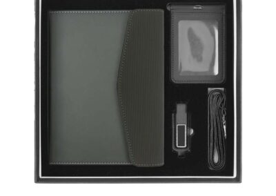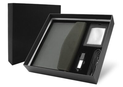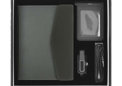 Promotional gift sets that include a variety of practical items such as an A5 PU notebook, a PU ID card holder with a leather lace, and a black PU USB drive with a light-up logo, all presented in elegant black cardboard gift boxes, have a sophisticated and professional appearance that is appropriate for a variety of corporate and business settings.