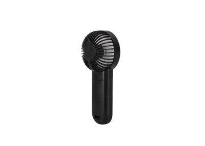 Small portable fan with additional stand to use as desk fan. 1 speed setting. Requires 2*AA batteries (not included).
