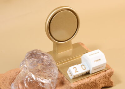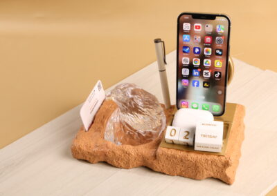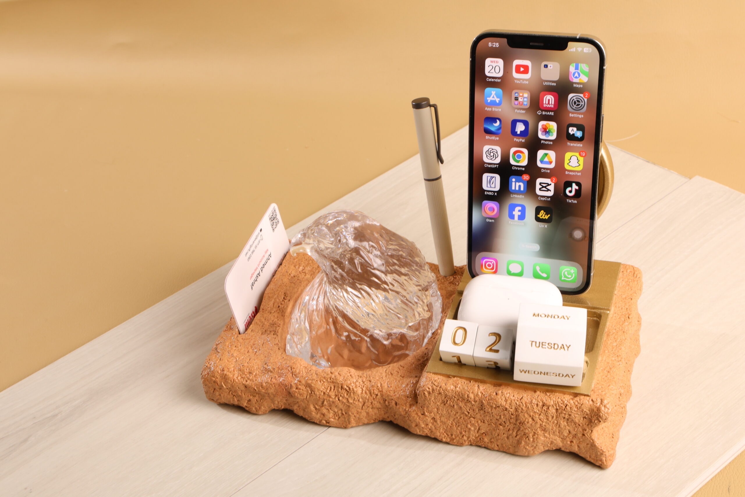 Crafted in the UAE, this crystal falcon head stands as a symbol of strength and heritage. The design is inspired by the spirit of the desert, created using elements shaped and produced locally. Set on a functional desktop base with card holder space, pen holder, phone stand and a calendar, it combines elegance with everyday utility.