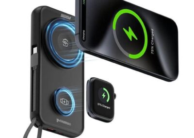 Rotterdam 5 in 1 universal charger is the ultimate portable charger, equipped with a robust 10,000mAh battery, 2 super-fast 15W magnetic wireless chargers to simultaneously charge your latest phone and smartwatch, and 2 in-built Lightning and Type C adaptors for seamlessly charging your iPhone or Android phones. Can simultaneously charge 5 devices at once. With its rapid PD 20W USB-C capability, you can recharge your PD-enabled device up to 50% in under 30 minutes. With battery indicator LED. Packed in a gift box