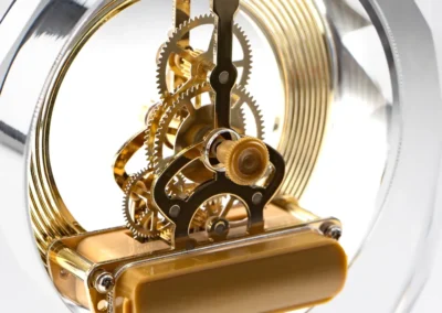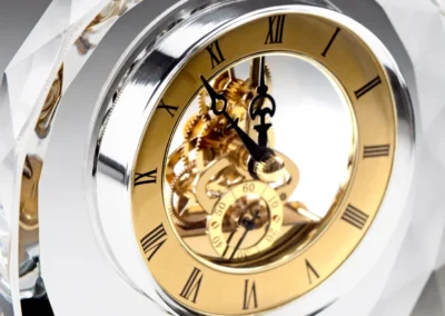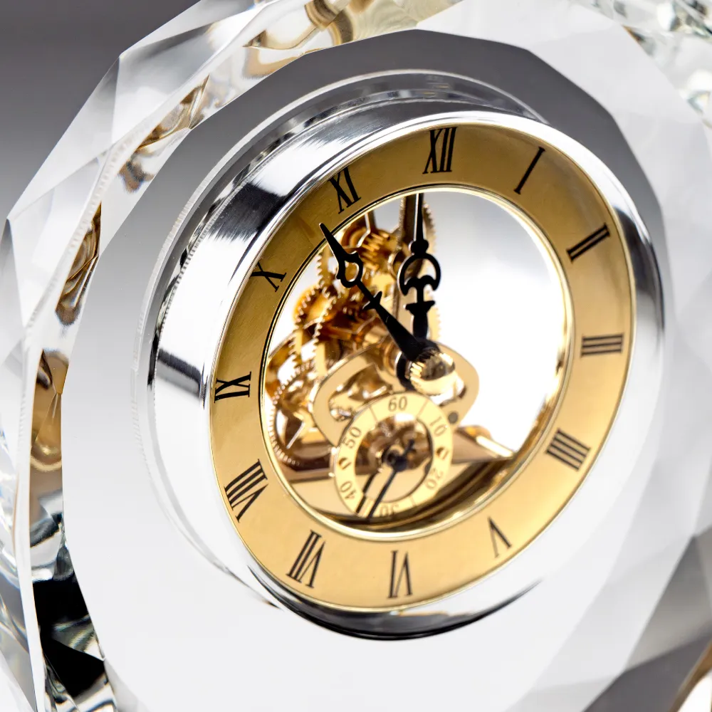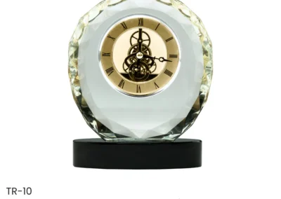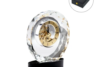 Packaging: Premium vertical-opening black fiberboard box with gold lock closure, The Round Crystal Clock Awards with Gold Skeleton Clock on a black oval glass base is a premium recognition piece that blends elegance with functionality. Ideal for corporate awards, executive gifts, and milestone celebrations, it comes in a luxury presentation box and supports multiple customization options. (Requires 1 x AAA battery – not included.)