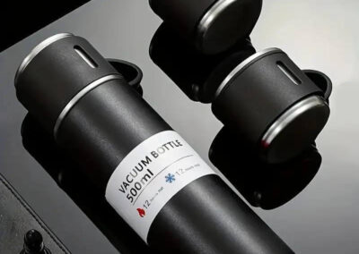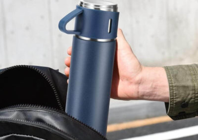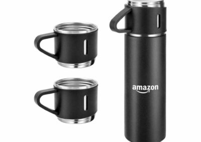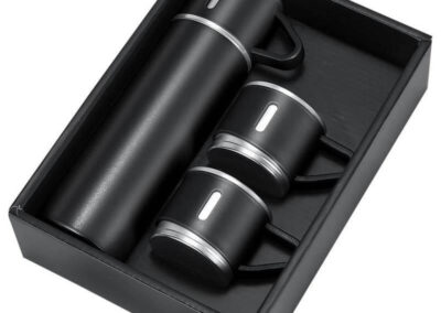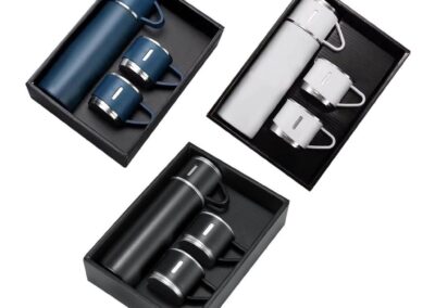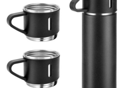 Family Gift Set of basic 500ml double-walled vacuum flask with 2 single-walled cups. Flask is leakproof, keeps drinks hot or cold and contains SS304 inside / SS201 outside. The 2 cups are 140ml each, lightweight with handle and made from SS304. Box packing.