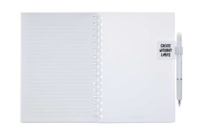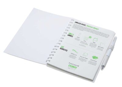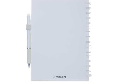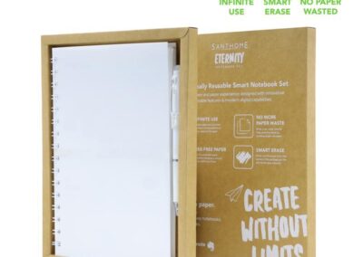 Explore eternal writing with the Santhome Eternity Notebook & Pen Set. Perfect for students and professionals who want to be more organized by combining handwritten notes with digital technology. Santhome Eternity includes a spiral notebook made from special erasable paper and a Santhome erasable pen for a smooth writing experience. Once all pages are used, use the Evernotes app to scan/organize important notes. Now, the magic happens! With the moistened cloth included, you can easily erase your notes endlessly to continue reusing your notebook, as good as new. Make a sustainable choice with reusable tree-free notebooks, and never throw another notebook away. Packed in an eco-friendly kraft paper gift box.