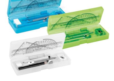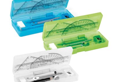 Material: PVC | Item Size : 165 x 68 x 25 mm | Item Weight: 0.200 kgThe branded geometry set is a piece of equipment that is frequently utilized in daily life. It was created with PVC. However, you can create a variety of geometric forms and figures using equipment known as geometric tools. To create all forms, lines, and angles in Euclidean geometry, utilize a branded geometry set. Additionally, the finest tool for routinely using basic geometrical diagrams and graphs is this geometry box. It also includes a pencil, a transparent plastic ruler, stencils for the alphabet and numbers, a stencil for a lab instrument, a metal divider compass, and a 180-degree protractor. available in a variety of hues. available in a 165 x 68 x 25 mm dimension. Additionally, you can modify the promotional geometry set to meet your needs. Screen printing and UV printing are both available. Its PVC body ensures its enduring toughness. Additionally, it is portable and lightweight.