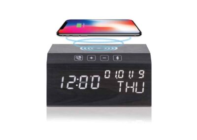 A combination of all the most useful daily electronic accessories into one comprehensive unit called the base station. The wireless charger at the top provides your wireless compatible devices with the fastest possible charge. The digital clock has a sharp white LED display. The Bluetooth speaker boasts incredibly clear sound and the touch-sensitive buttons allow you to control the volume, and song and answer calls with ease. Comes in a premium wooden finish.