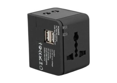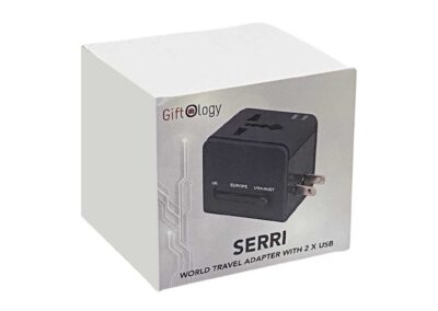 Travel Adaptor covering 4 global outlet types: US, EU, UK, AUS/CN and 2 USB-A output points. Promotional variety. Includes PU travel pouch, packed in a gift box.