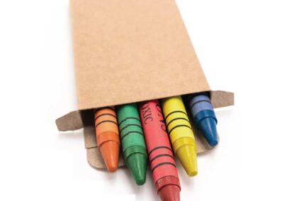Set of 6 crayons in natural cardboard box. With cylindrical body in varied colors. Including crayons in 6 colors