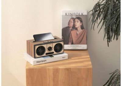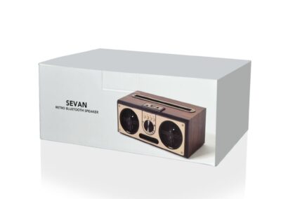 Sevan is a powerful 20W Bluetooth wooden speaker with stereo sound (two loud speakers inside + bass) and flexibly plays music via Bluetooth, AUX in, TF card, USB host or FM radio. Comes with 1500mAh lithium battery and works as far as 10 meters pairing distance. Its unique retro look adds nostalgia and inspires fun.