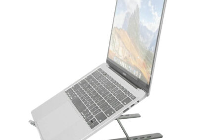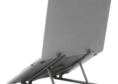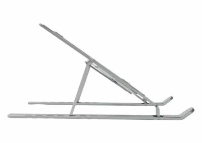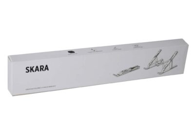 Skara is a quality folding laptop stand made of heavy-duty aluminum and including extendable, height-adjustable legs with anti-slip rubber pads for a solid fit to the laptop computer and desk surface. Compact folding size, and presented in a gift box.