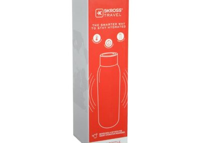 Drinking enough water each day, and knowing how much to drink is hard. Skross® PRO 21oz. Smart Water Bottle makes it easy one sip at a time. With our smart lid, you can set hydration reminders at regular intervals of your choice – 1 hrs / 1.5 hrs / 2 hrs using the LCD touchscreen in the lid. It also tells you the temperature of the beverage inside. The lid works for 30 days on a single charge, and comes with a magnetic charger for recharging once a month. The smart water bottle is vacuum-insulated stainless steel keeps drinks hot for up to 12 hours and cold for up to 24 hours. Capacity: 600ml. Designed by Skross – a leading Swiss design brand. Includes 1 year warranty.