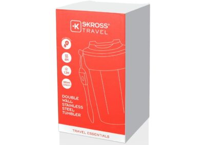 Skross Double Wall Stainless Steel Tumbler is a premium quality travel tumbler perfect for office or travel use. Its shape fits most beverage holders. It is made with ultra corrosion-proof highest quality SS-316 stainless steel inside. This tumbler is 100% leak proof, BPA-free, vacuum insulated and keeps drinks hot for 6 hours and cold for 12 hours. Content: 480 ml. Designed by Skross – a leading Swiss design brand.