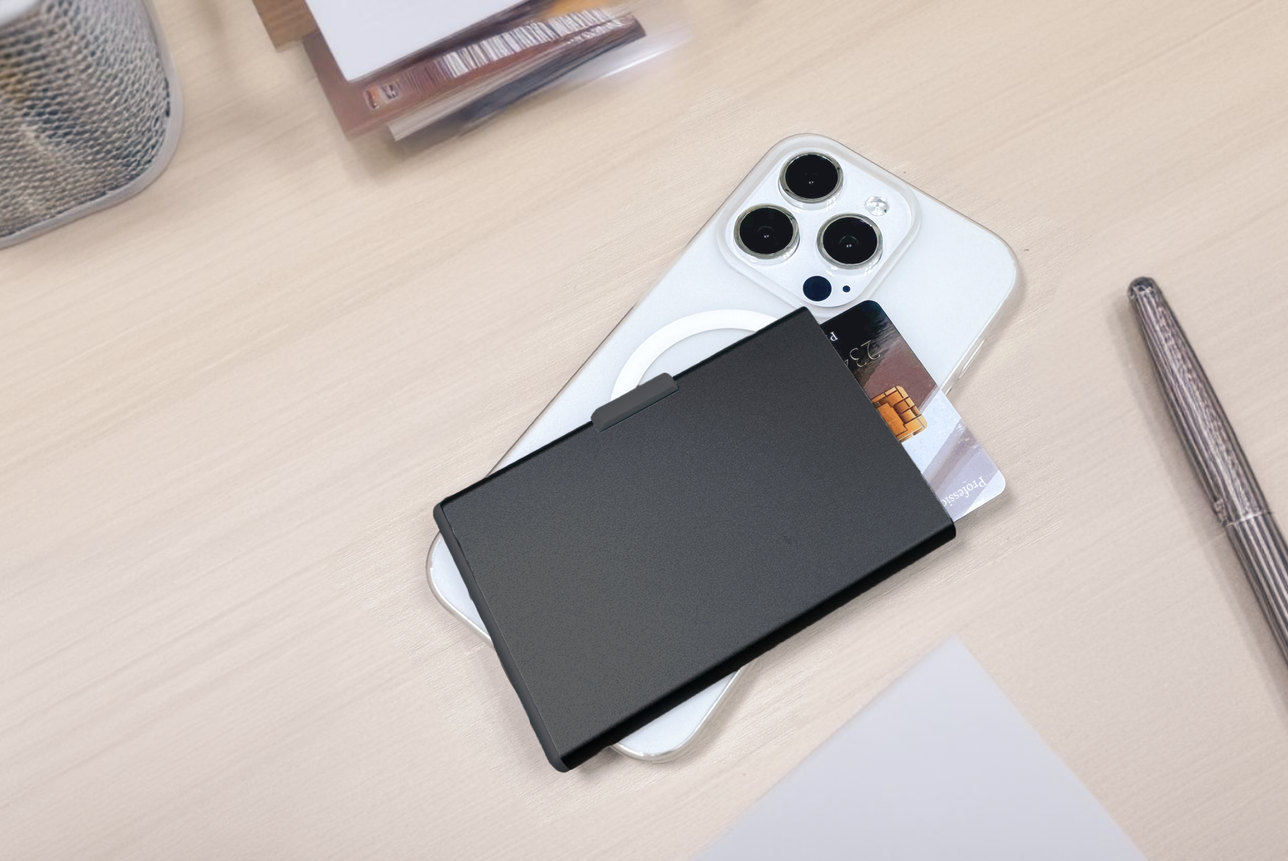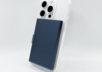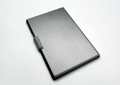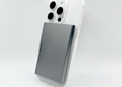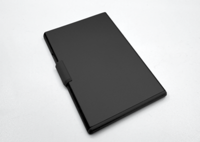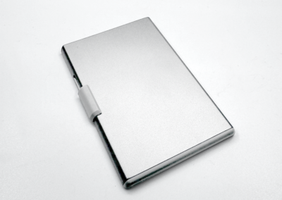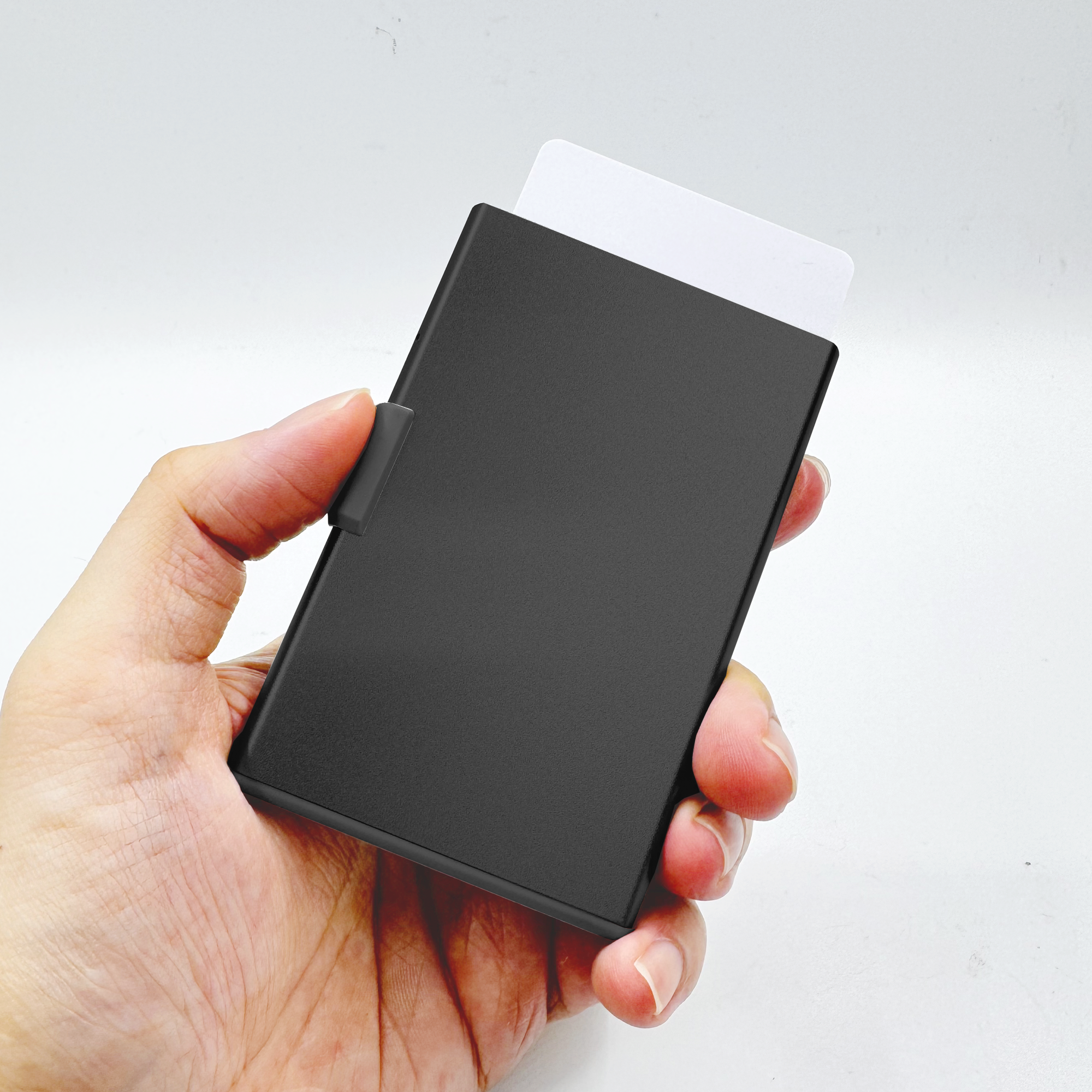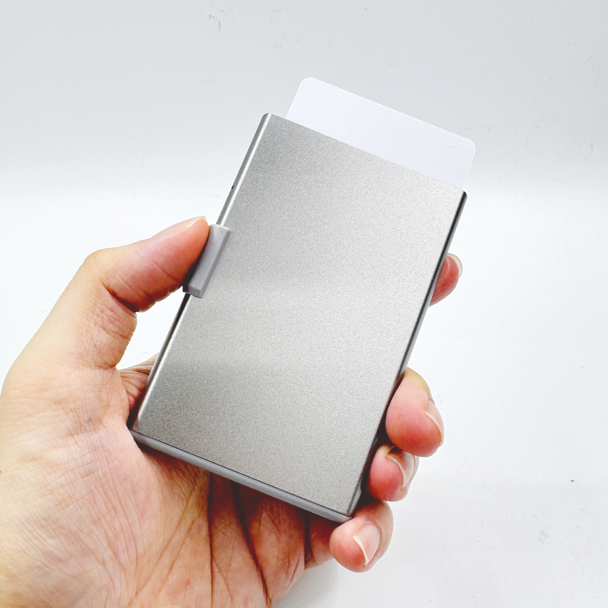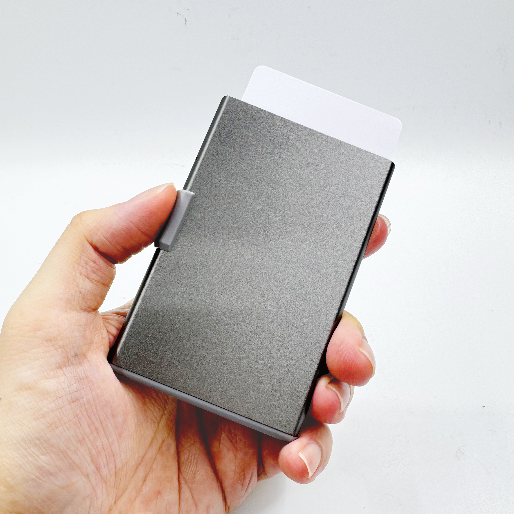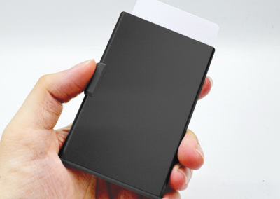 RFID and NFC blocked strong magnetic aluminium card holder made from recycled PU-RCS that can hold up to 3 cards with slide the level function to eject the cards. Product Size: 9.5×6.2×0.8CM Packaging: Kraft Box