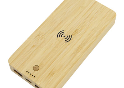 10000 mAh power bank with 5W wireless charger made from eco-friendly bamboo material with wireless charging properties. Comes with 2 USB outputs & type C input.