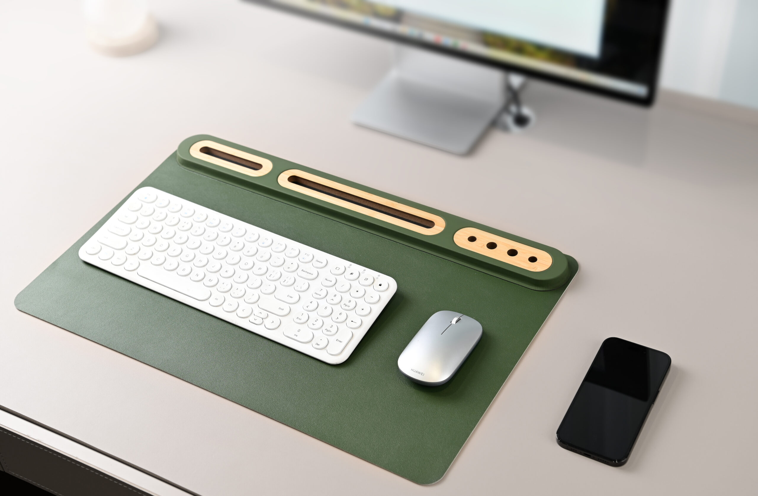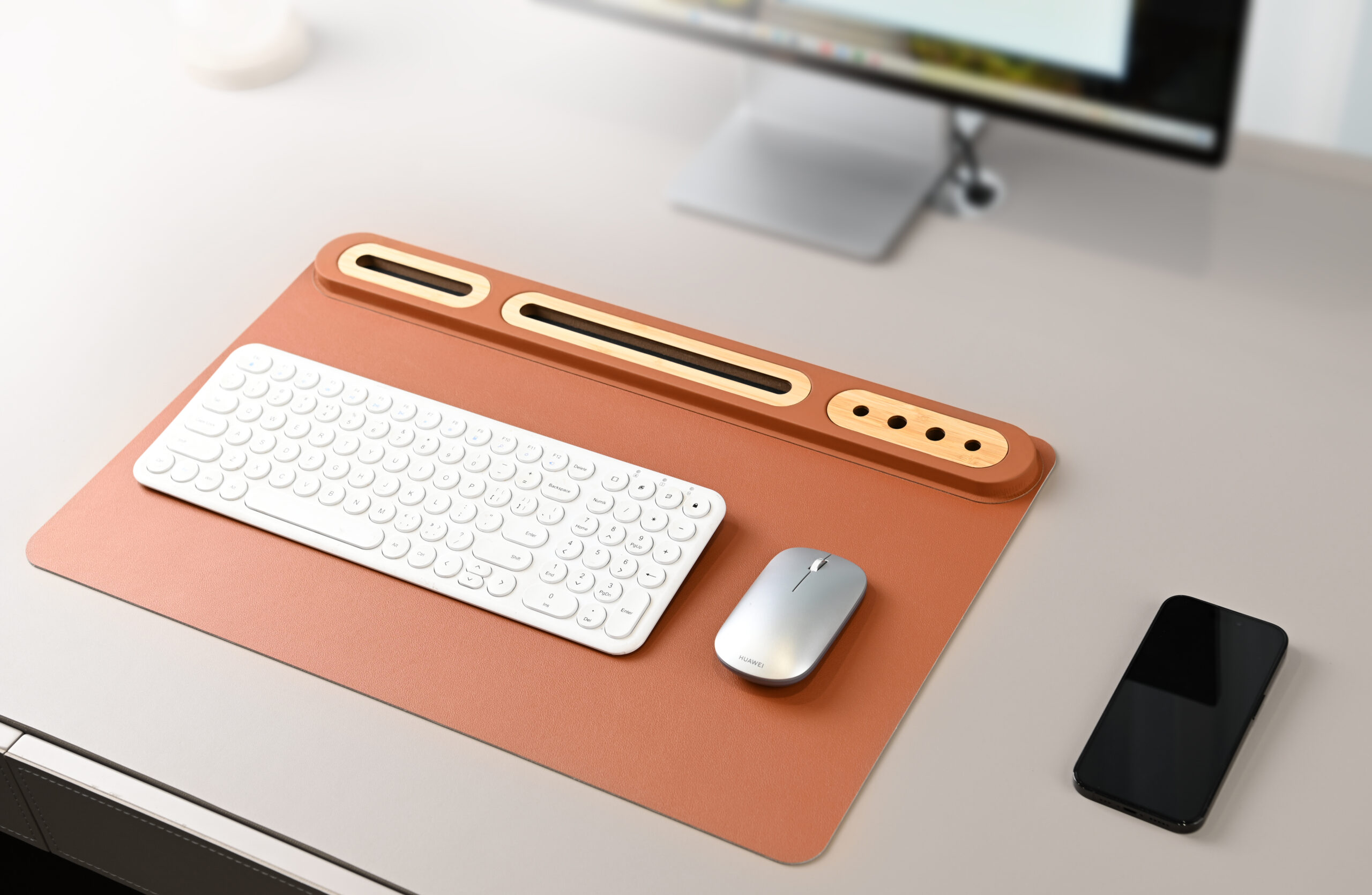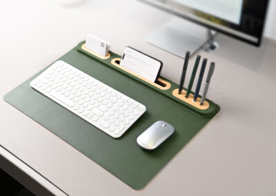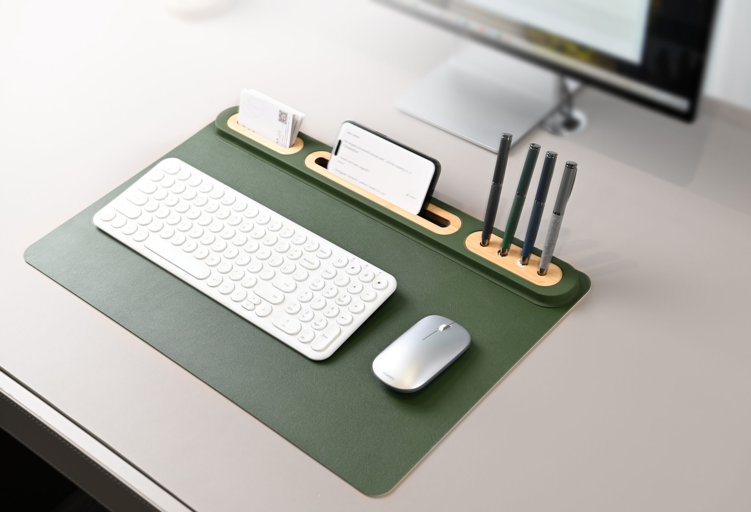 Desk mat organizer in a soft recycled PU Material with bamboo organizers: tablet/ipad holder, pen holder and business card holder.Product Size: 55x35x1.5cm. Packaging: Kraft Paper Box