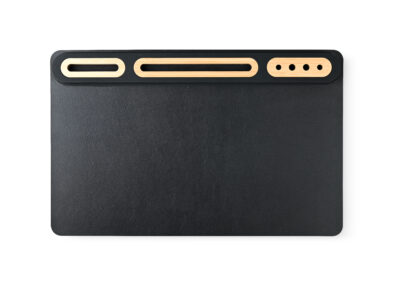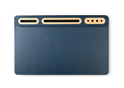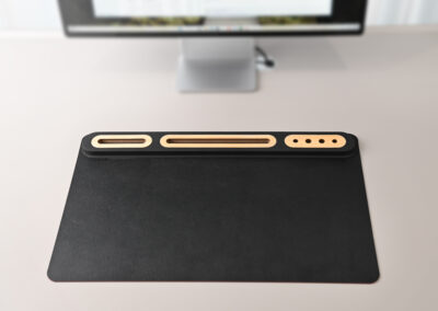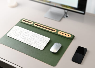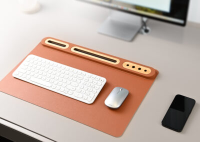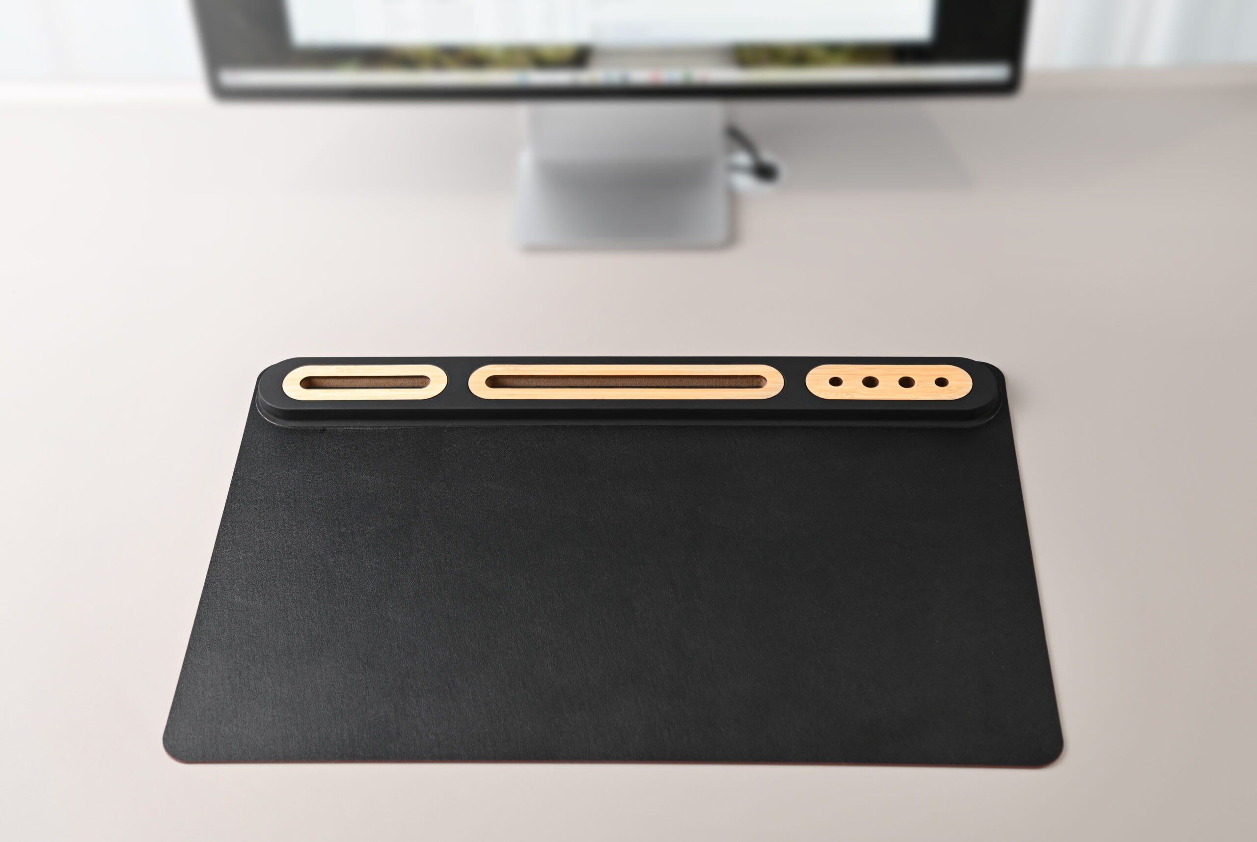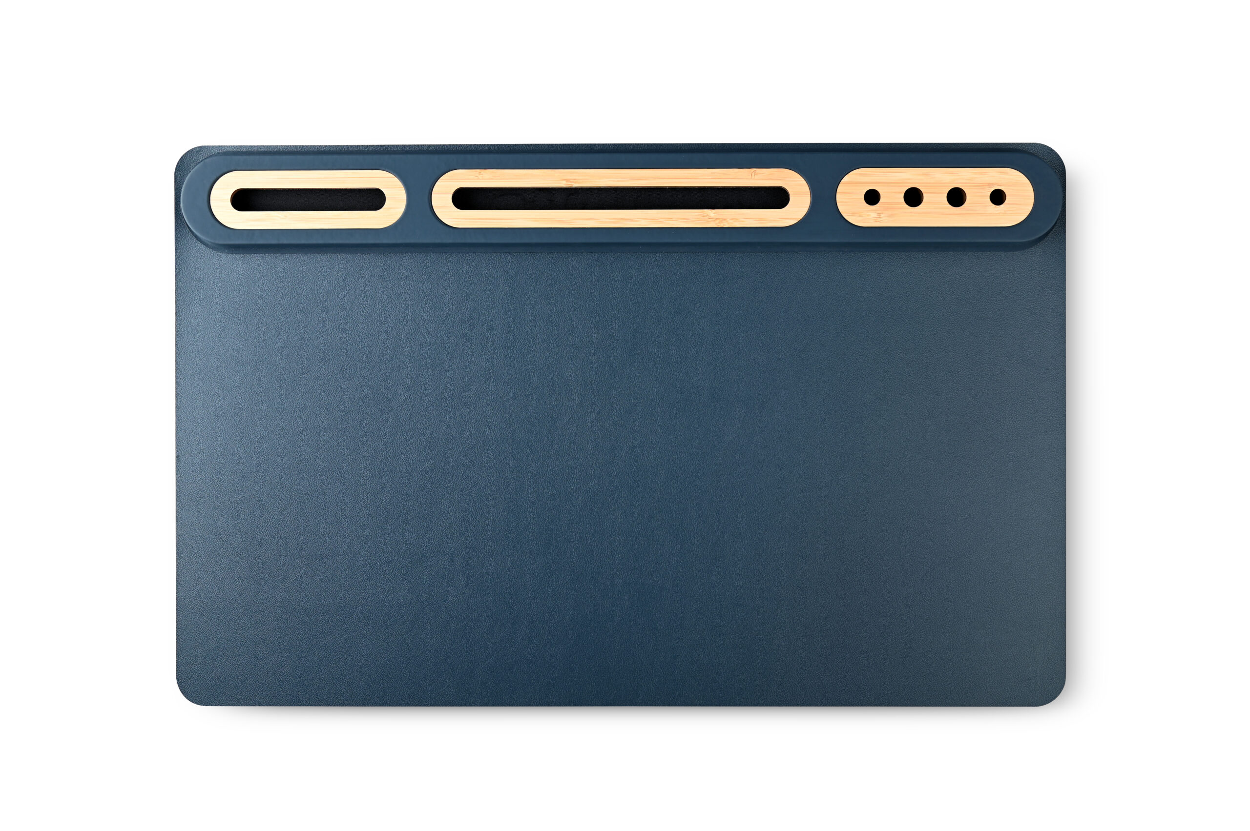 Desk mat organizer in a soft recycled PU Material with bamboo organizers: tablet/ipad holder, pen holder and business card holder.Product Size: 55x35x1.5cm. Packaging: Kraft Paper Box