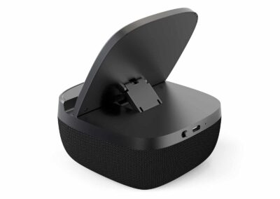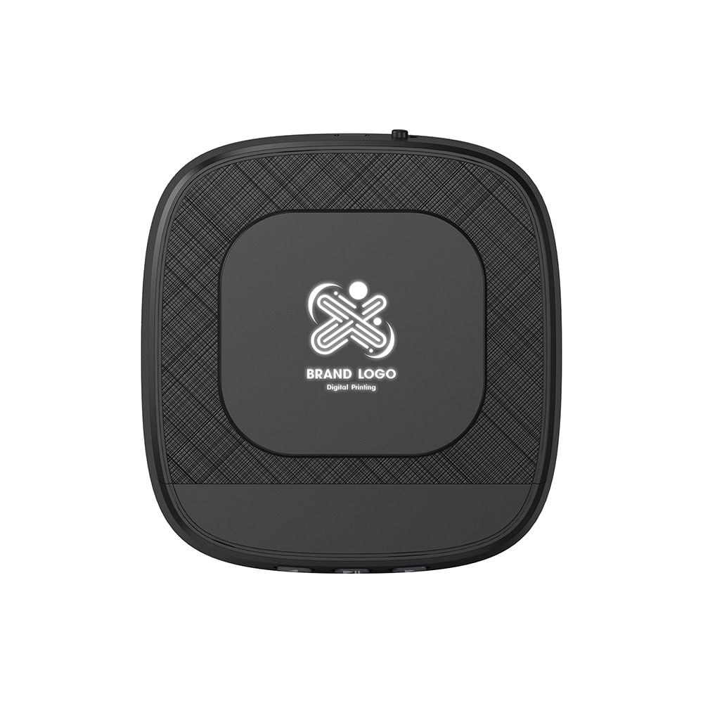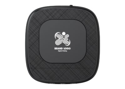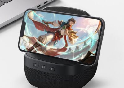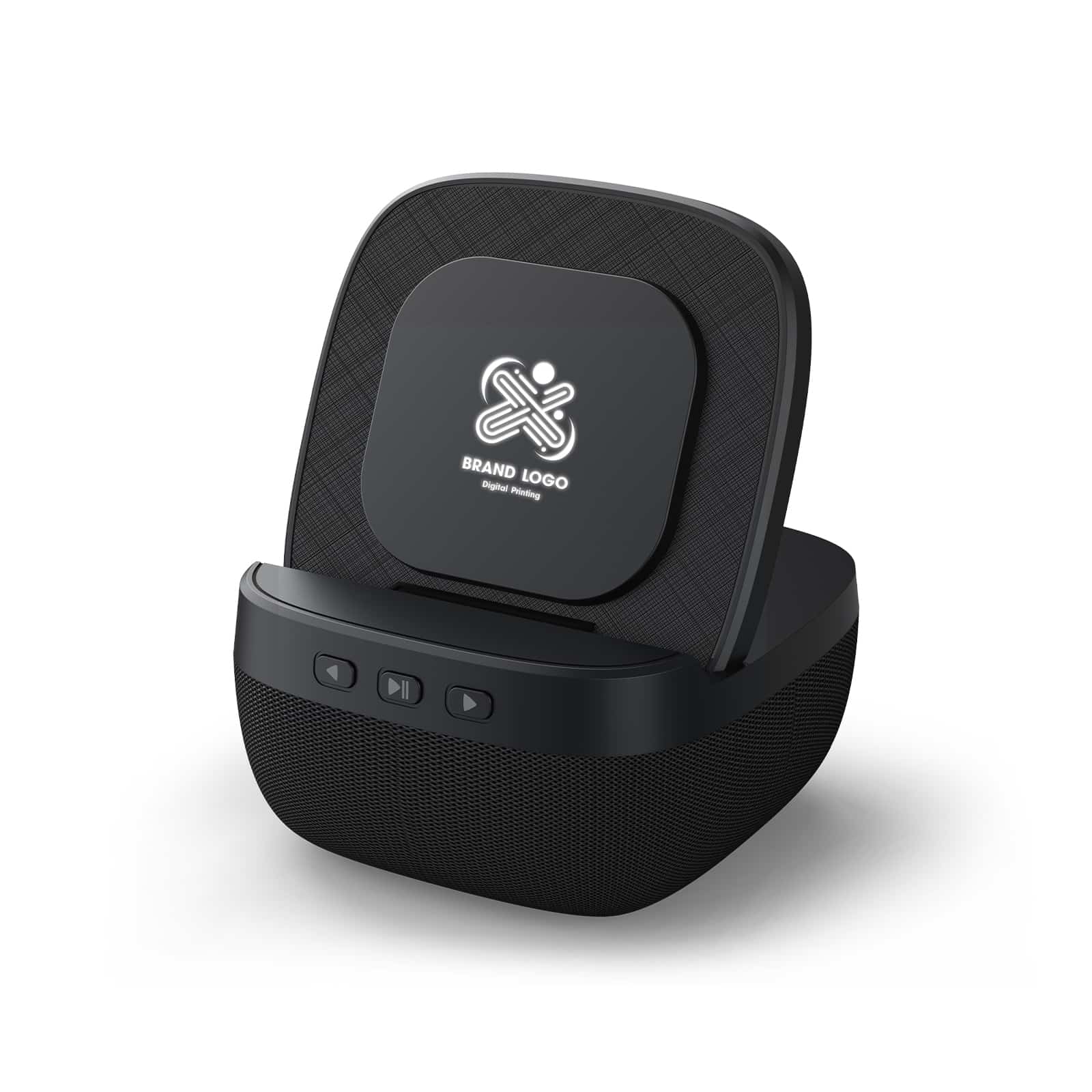 Loud 5W Speaker 2,000mAh powerbank with 15W Wireless Charger Light Up Logo speaker mobile stand with ABS + Linen Material.