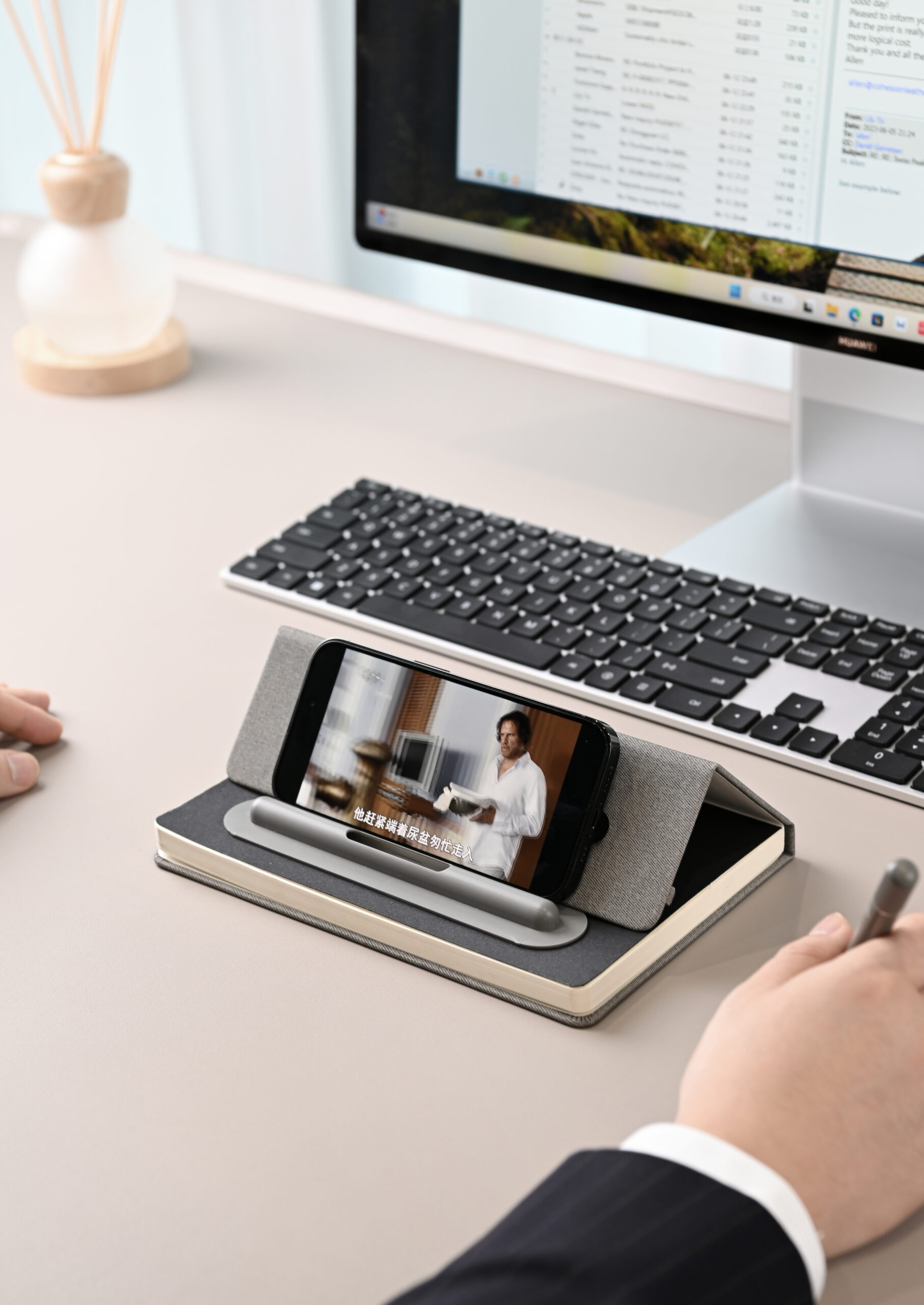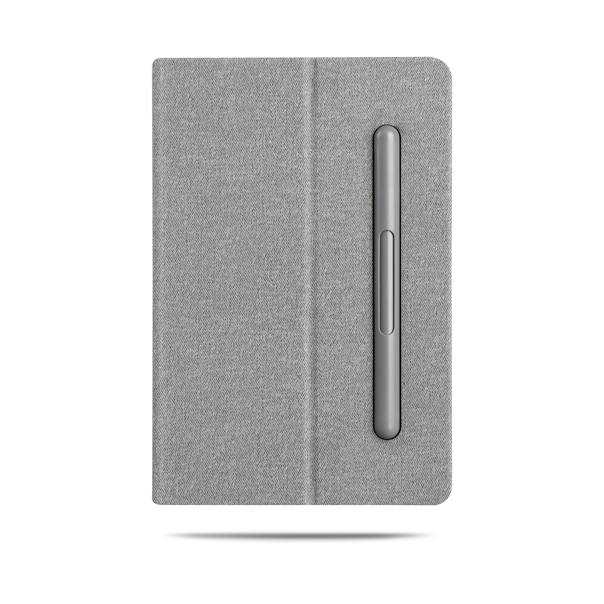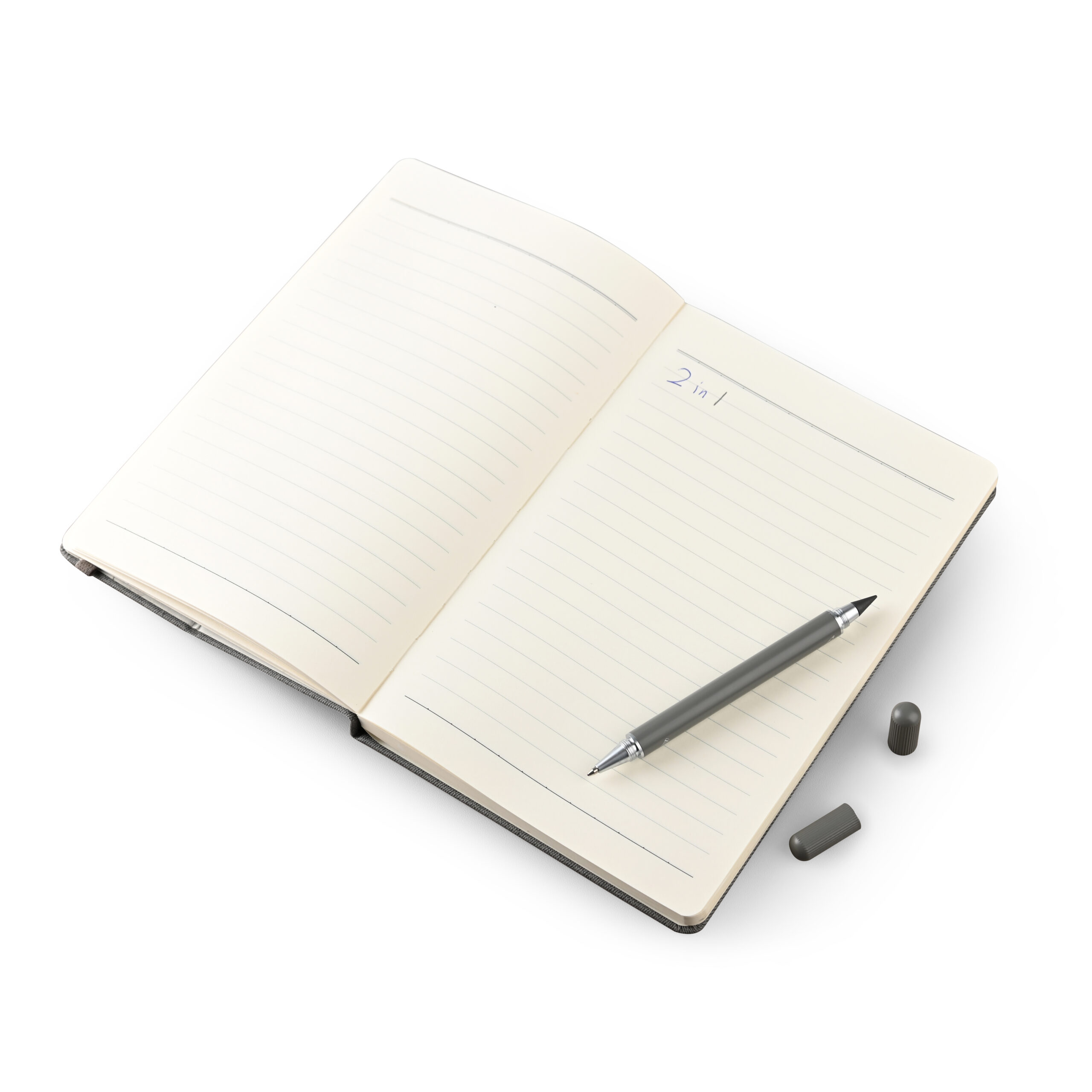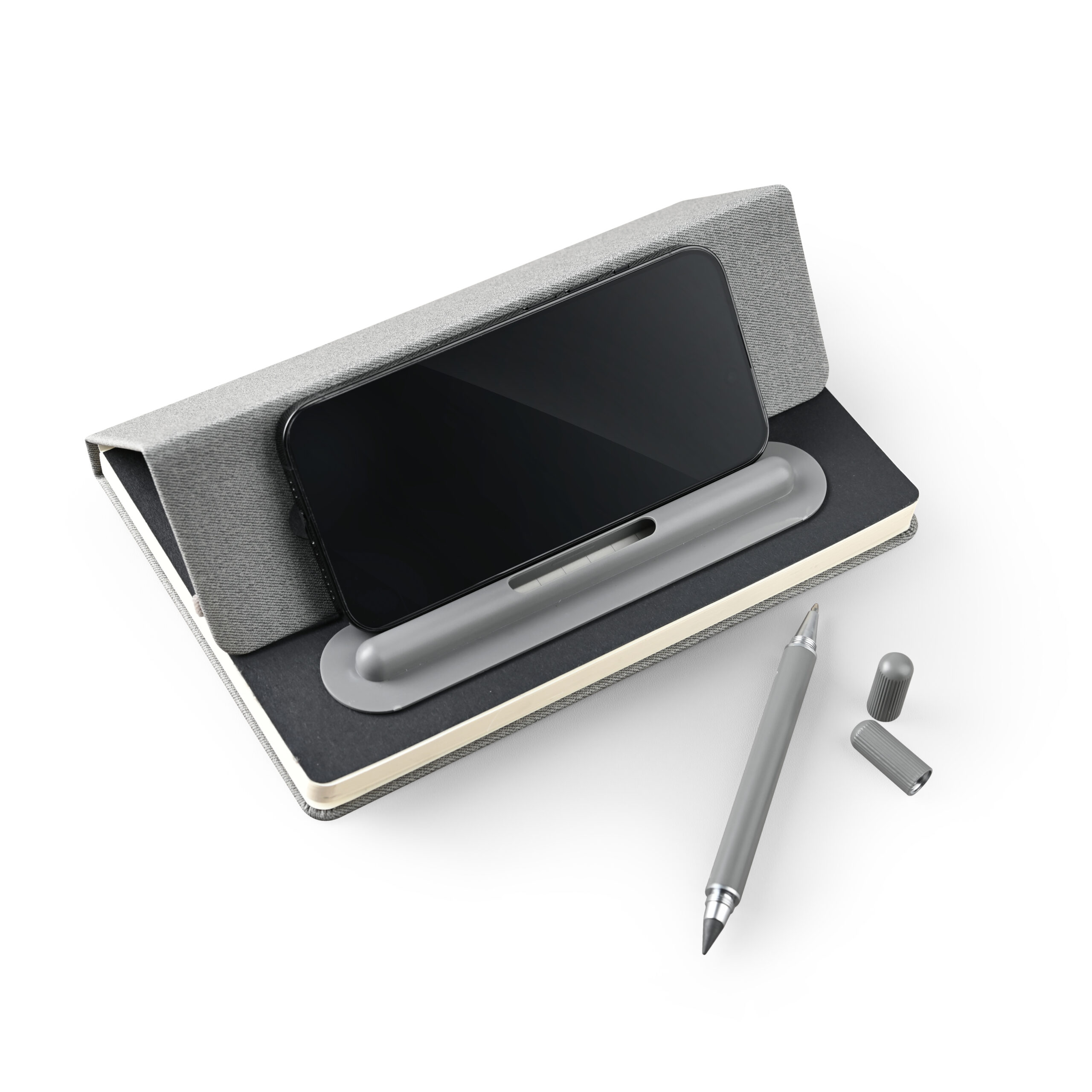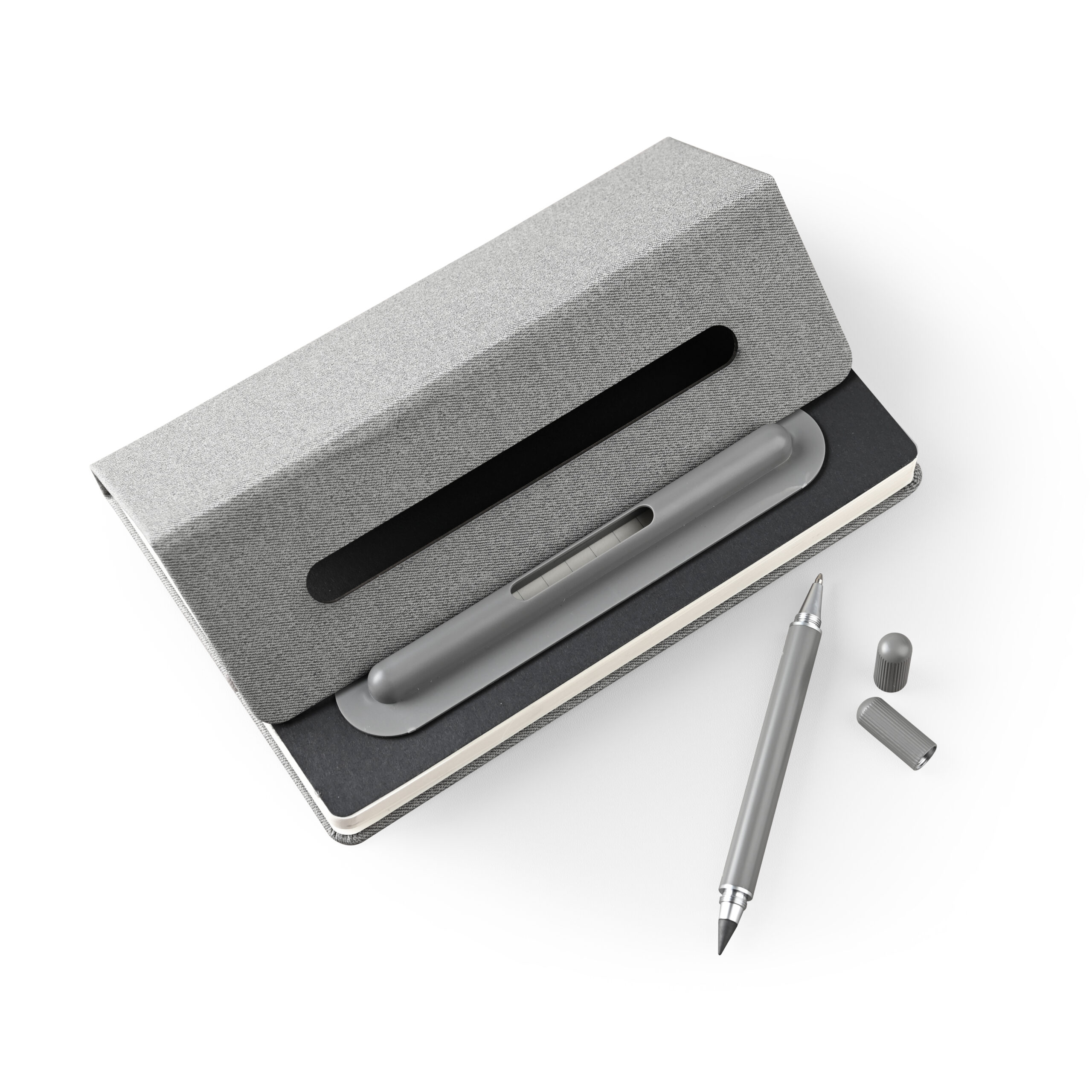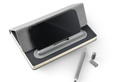 A5 Notebook with 2n1 writing instruments: pen and pencil on the otherside and has elastic for closure in recycled PU Material. Notebook has fold on the cover that serves as a mobile stand. Product Size: 20×14.1×1.5cm. Packaging: Kraft Paper Box