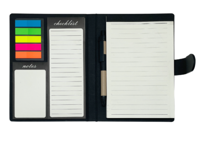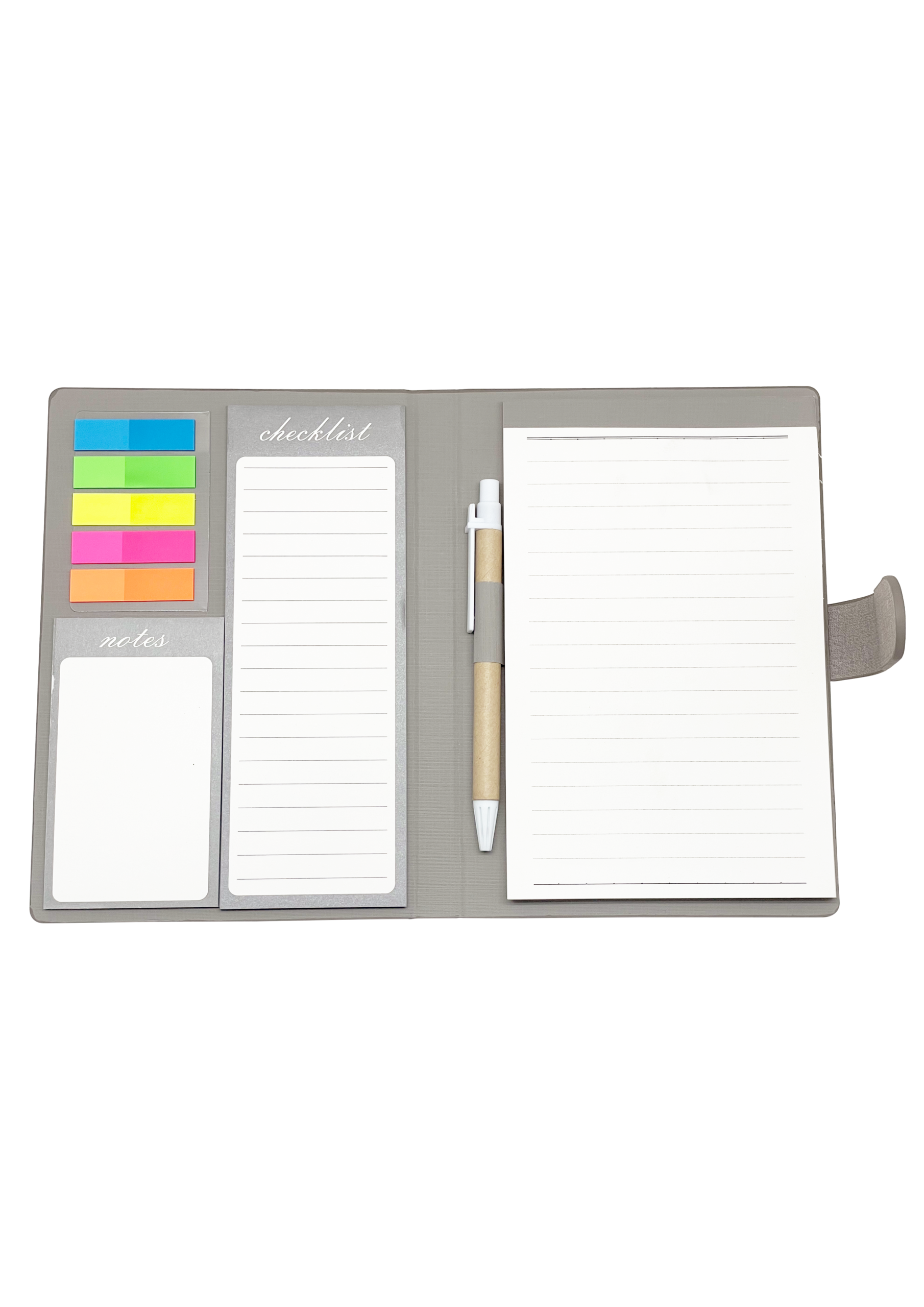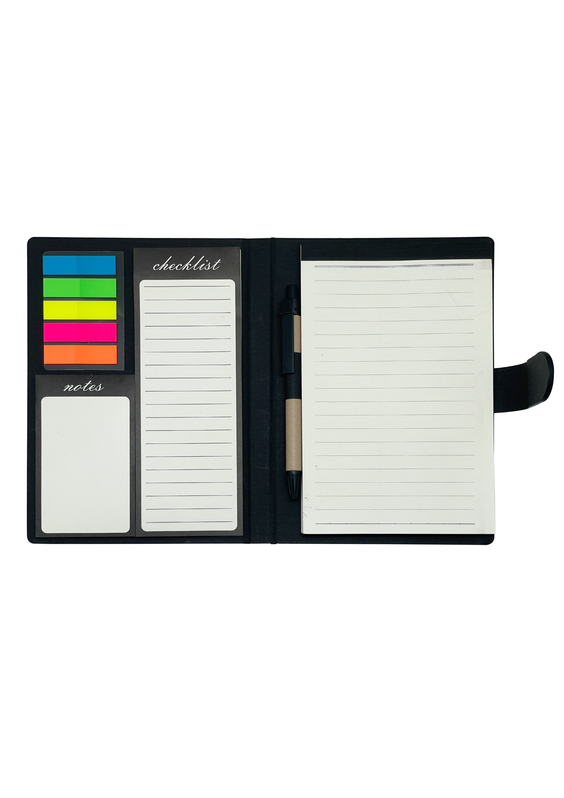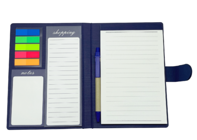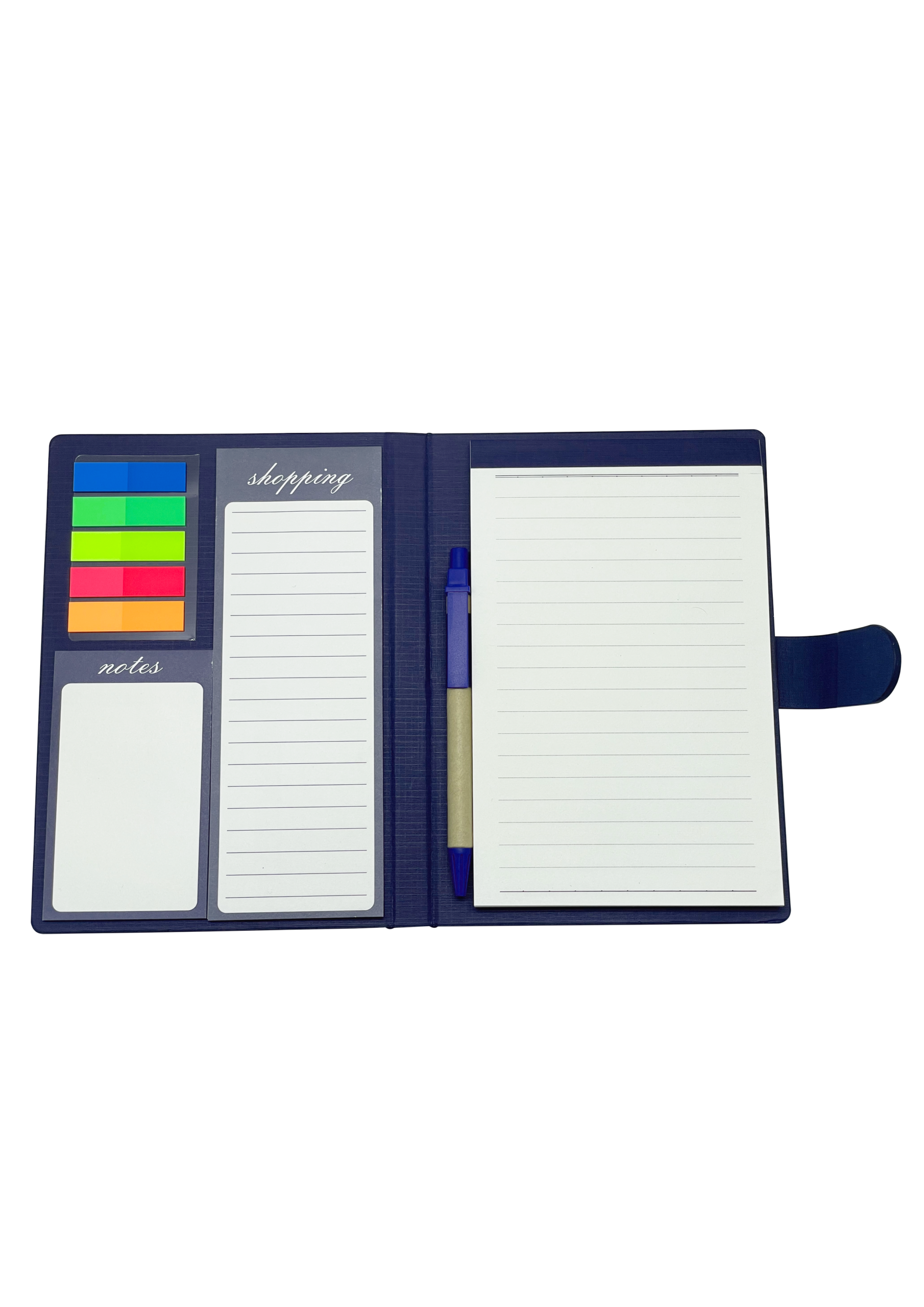 Stationery Notebook in Thermal PU Cardboard Cover with Magnet Closure. Has pen and sticky notes inside. Product Size: 19.6×13.6x2cm. Packaging: Polybag