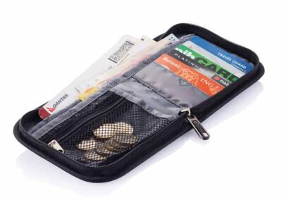 1680D zippered travel wallet with metal Swiss Peak logo on the front. All pockets required for a comfortable and practical journey are present there. Furthermore integrated cord allows easy hanging of the wallet around your neck. Registered Design®