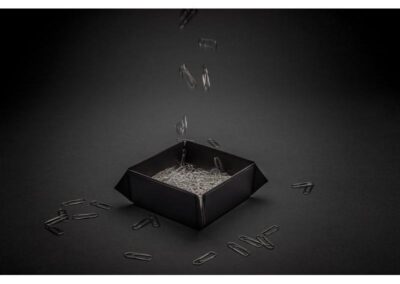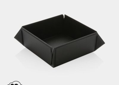 Foldable and magnetic storage box made with RCS certified recycled PU. Total recycled content: 21% based on total item weight. RCS certification ensures a completely certified supply chain of the recycled materials. The storage box comes flat in the packaging and can easily be folded into a storage box with the integrated magnets. Perfect for your desk or your bedside table. Packed in FSC® mix packaging.