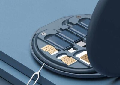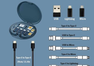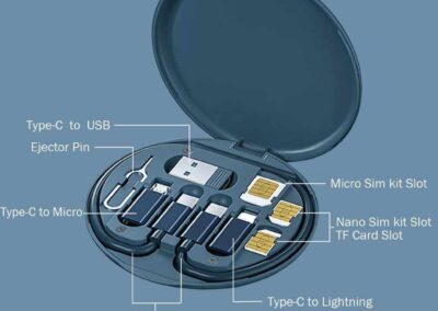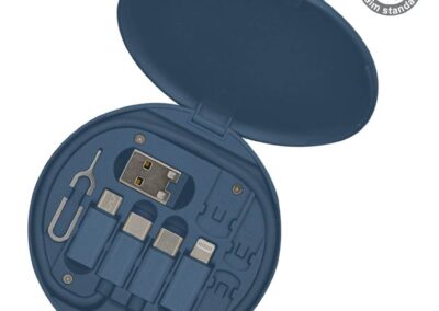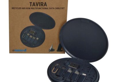 Multi-cable set with charging cables for all your essential connections: Type C, Lightning, micro USB and USB. Also comes with an ejector pin and 3 storage slots for micro SIM, nano SIM and TF SIM cards. Tavira is made from RCS-certified recycled plastic and has all your essential technology accessories in a compact travel size case. It can also serve as a phone or tablet stand for an added on-the-go convenience. A great giveaway idea for your customers to remember you!