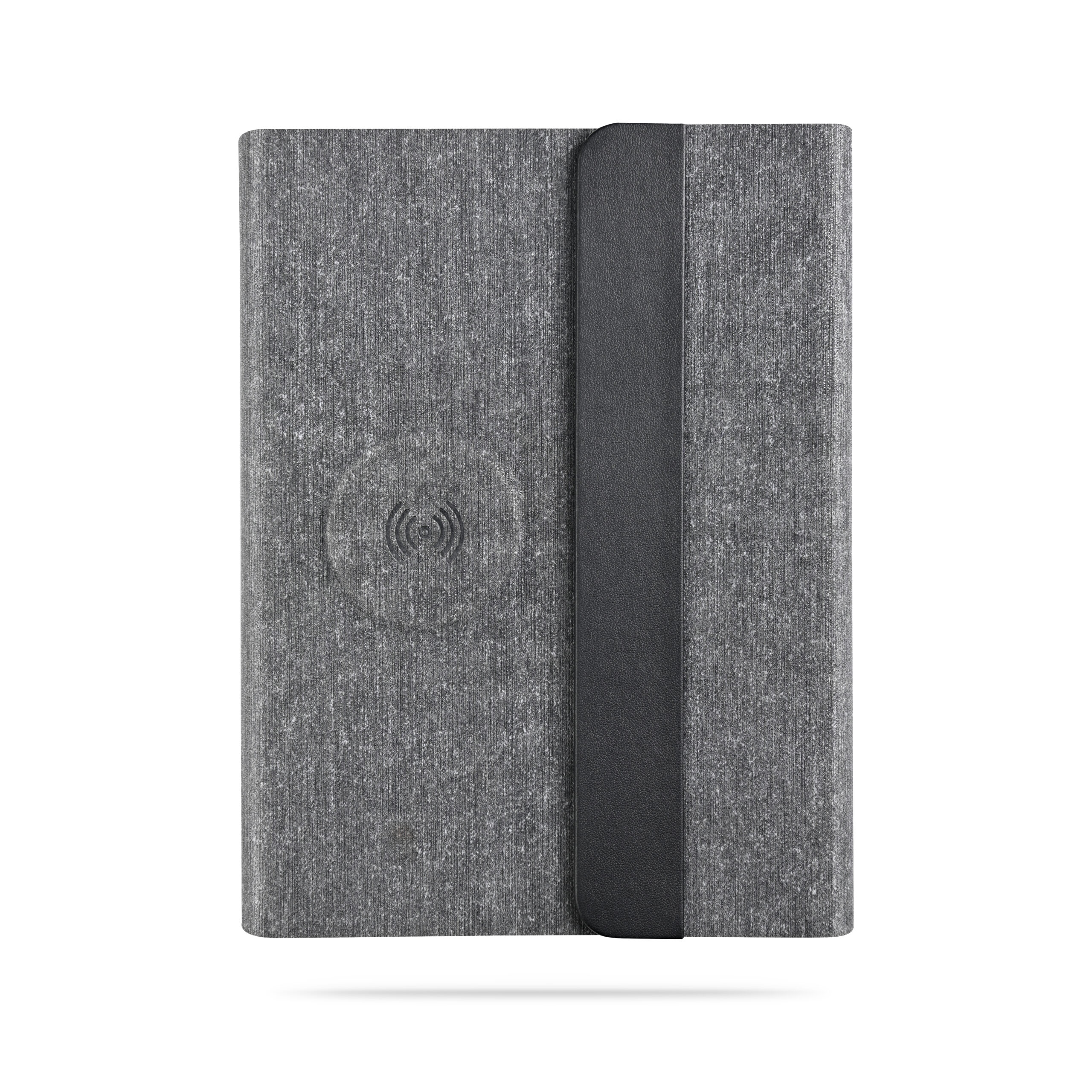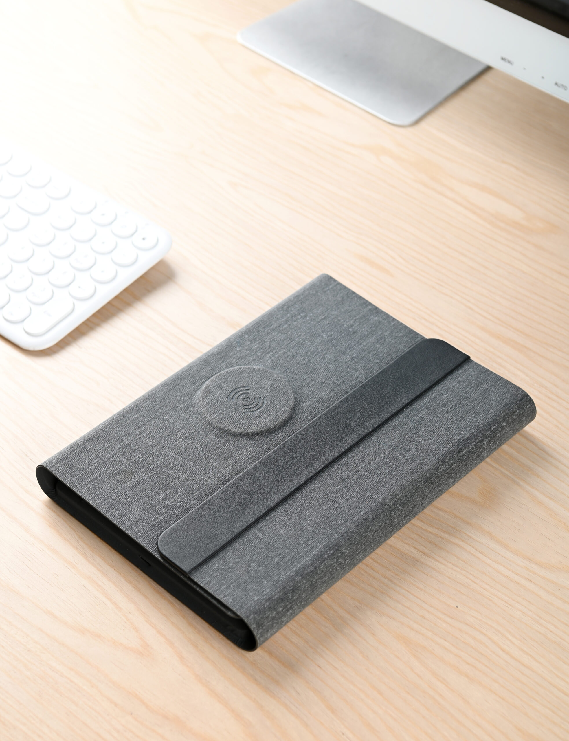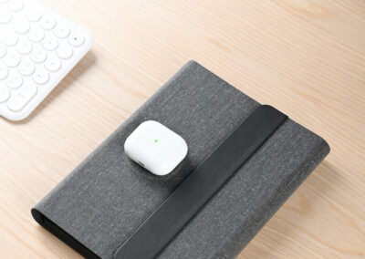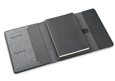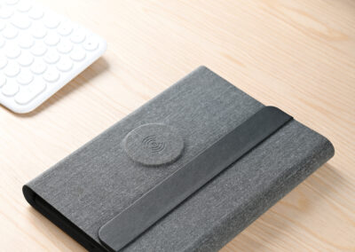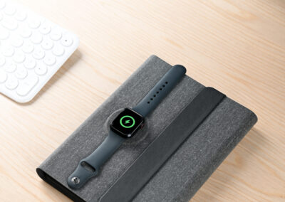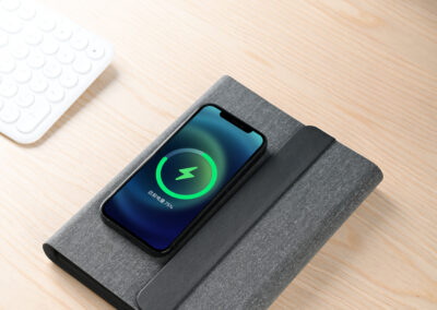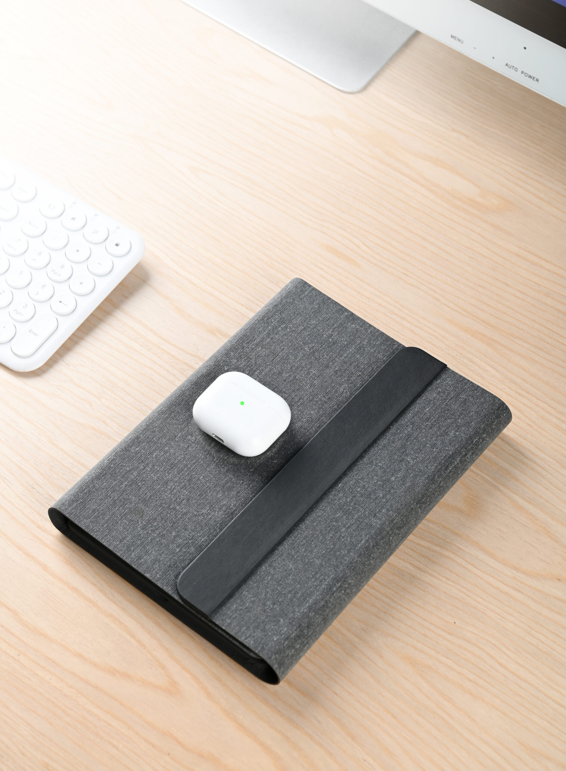 3n1 Magsafe charging 80 sheets notebook with 5000mAh powerbank which can charge mobile (up to 15W), apple watch (up to 5W), airpods (up to 2.5W) in recycled PU-RCS material, paired with metal pen. Product Size: 23×17.5×2.8cm Packaging: Hard Paper Box