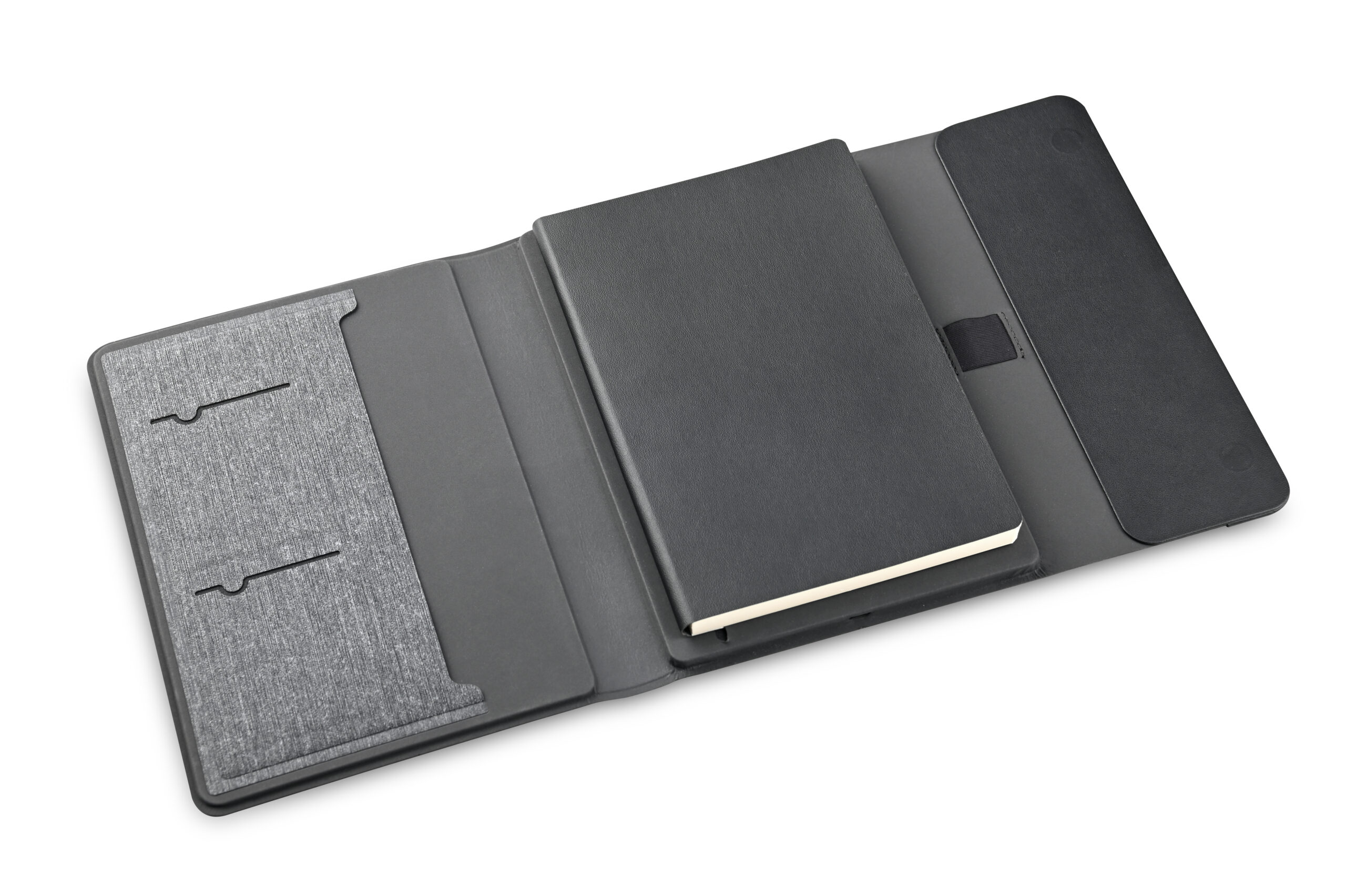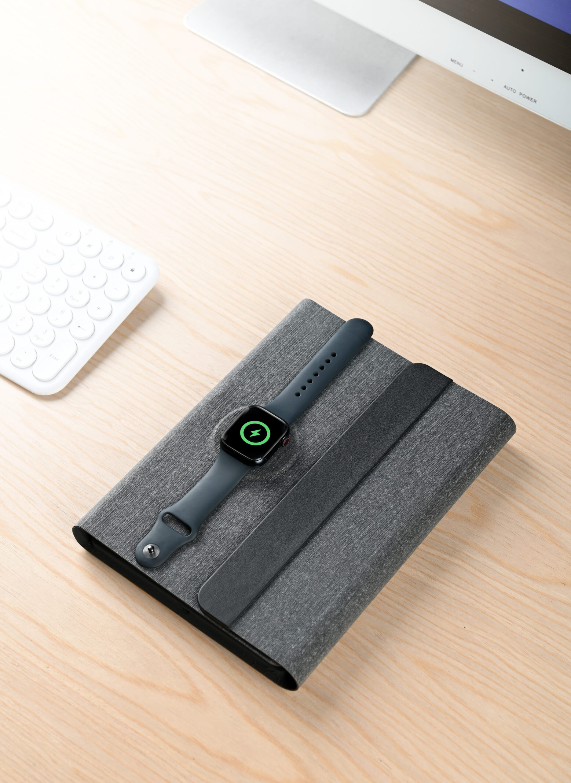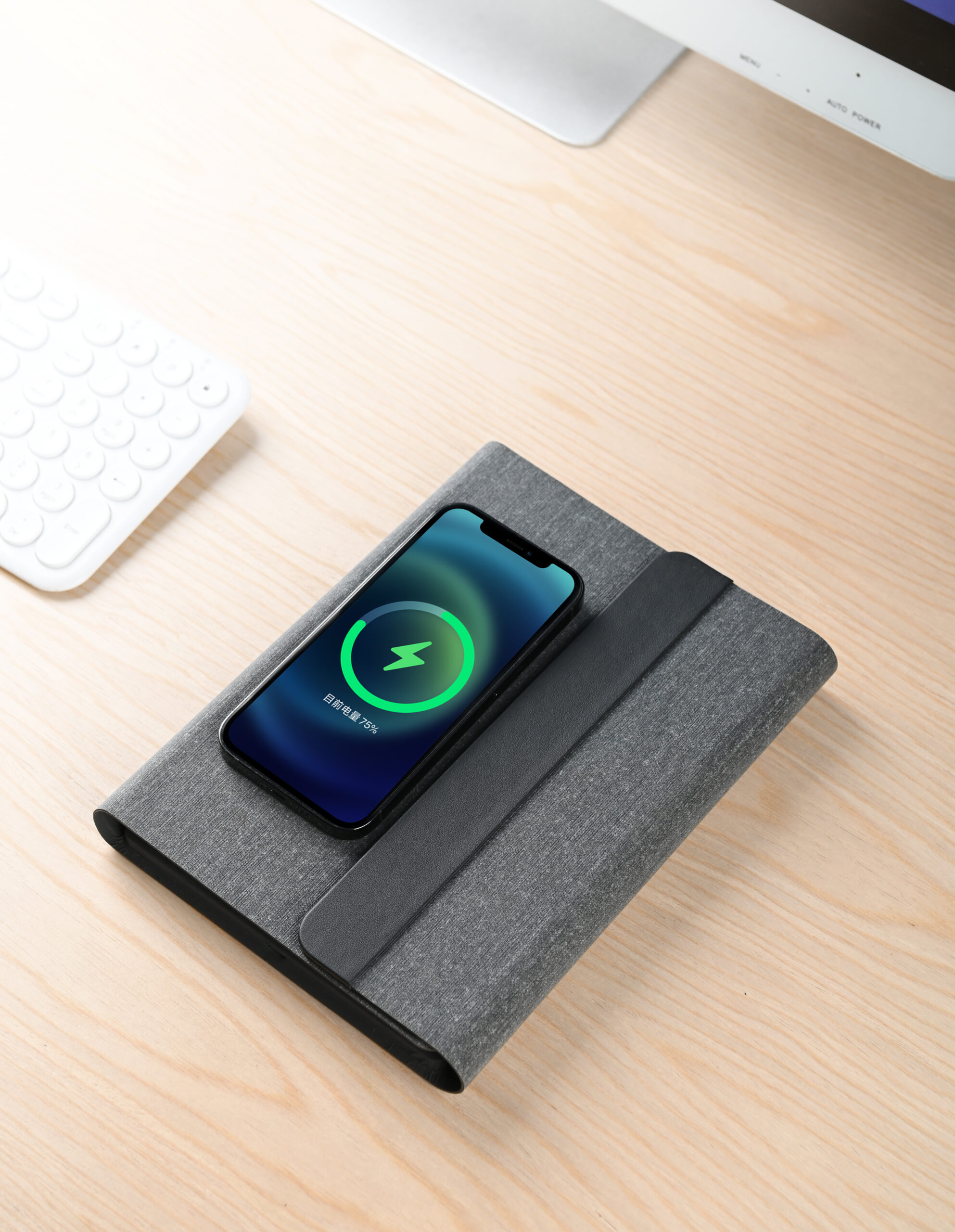 3n1 Magsafe charging 80 sheets notebook with 5000mAh powerbank which can charge mobile (up to 15W), apple watch (up to 5W), airpods (up to 2.5W) in recycled PU-RCS material, paired with metal pen. Product Size: 23×17.5×2.8cm Packaging: Hard Paper Box