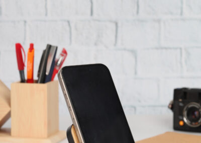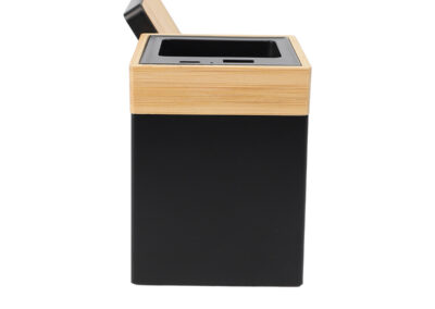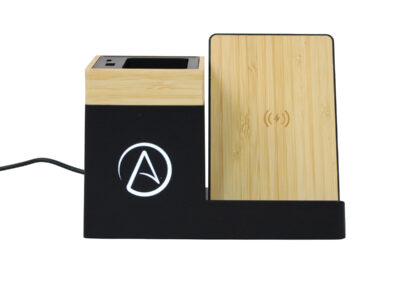 A multi-function pen stand with wireless charging and manual charging features. Made from bamboo & black ABS and has a white LED panel.